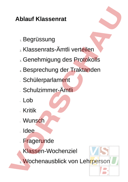 Protokoll, Ablauf und Traktandenliste zum Gestalten eines Klassenrats. Schüler moderieren selber.