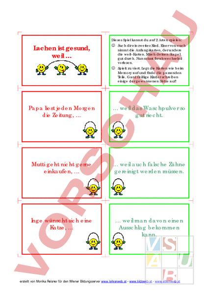 Dieses Spiel kannst du auf 2 Arten spielen: Lachen ist gesund, weil Such dir ein zweites Kind. Einer von euch nimmt die Anfangskarten, der andere die weil – Karten. Misch deinen Stapel gut durch. Nun müsst ihr abwechselnd vorlesen. Spielt zu viert. Legt die Karten wie beim Memory auf und finde die passenden Teile. Ganz fleißige Kinder schreiben einige der gewonnenen Sätze auf! Papa liest jeden Morgen die Zeitung, weil das Waschpulver so gut riecht. Mutti geht nicht gerne einkaufen, weil auch falsche Zähne gereinigt werden müssen. Inge wünscht sich eine Katze, weil man davon einen Ausschlag bekommen kann. erstellt von Monika Reisner für den Wiener Bildungsserver www.lehrerweb.at www.kidsweb.at www.elternweb.at Robert will seinen Wollpullover nicht anziehen, weil man dadurch vieles erfährt. Heute hat schon fast jede Familie einen Computer, weil das sehr gesund ist. Oma gibt ihre Zähne ins Wasserglas, weil die Kassierin im Supermarkt gar nicht nett ist. Im Fasching verkleiden sich die Menschen, weil das eine närrische Zeit ist. erstellt von Monika Reisner für den Wiener Bildungsserver www.lehrerweb.at www.kidsweb.at www.elternweb.at Die Frau Lehrerin erklärt die Hausaufgabe, weil es vor langer Zeit noch keine Häuser gab. Michael sitzt jeden Tag vor dem Fernseher, weil sich sonst niemand auskennt. Jedes Kind liebt Speiseeis, weil niemand das Gerät abdreht. Sandra vergisst oft die Hausaufgabe, weil es so schön kalt ist. erstellt von Monika Reisner für den Wiener Bildungsserver www.lehrerweb.at www.kidsweb.at www.elternweb.at Manche Kinder fahren zu schnell mit ihrem Roller, weil so viel andere Dinge zu tun sind. Mein Opa trinkt gerne Milch, weil man damit so nett spielen kann. Der Mechaniker repariert das Auto, weil das sehr praktisch ist. Sonja gibt ihre Bluse oft in die Waschmaschine, weil eine große Delle darin ist. erstellt von Monika Reisner für den Wiener Bildungsserver www.lehrerweb.at www.kidsweb.at www.elternweb.at Die Urmenschen lebten in Höhlen, weil dann der Wind so schön ins Gesicht bläst. , weil , weil , weil erstellt von Monika Reisner für den Wiener Bildungsserver www.lehrerweb.at www.kidsweb.at www.elternweb.at