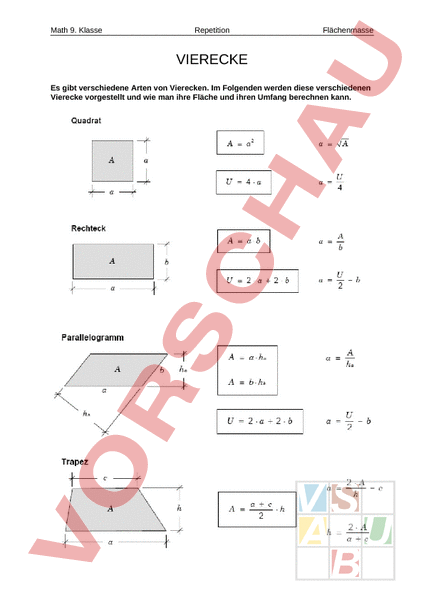 Math 9. Klasse Repetition Flächenmasse VIERECKE Es gibt verschiedene Arten von Vierecken. Im Folgenden werden diese verschiedenen Vierecke vorgestellt und wie man ihre Fläche und ihren Umfang berechnen kann. Math 9. Klasse Repetition Flächenmasse