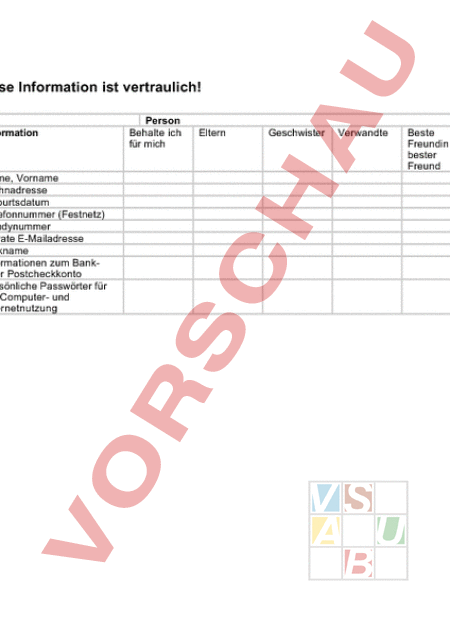 Diese Information ist vertraulich! Information Name, Vorname Wohnadresse Geburtsdatum Telefonnummer (Festnetz) Handynummer Private E-Mailadresse Nickname Informationen zum Bankoder Postcheckkonto Persönliche Passwörter für die Computer- und Internetnutzung Person Behalte ich für mich Eltern Geschwister Verwandte Beste Freundin, bester Freund Kollegin, Kollege Jemand, den ich im Internet kennenlerne Unbekannte Person