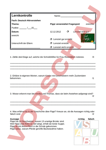 Lernkontrolle Name:_ Fach: Deutsch Hörverstehen Thema: Pippi veranstaltet Fragesport erreichte Punkte: /_15_ Datum: 12.12.2012 Lernziel sehr gut erreicht Lernziel gut erreicht Unterschrift der Eltern: Lernziel erreicht Lernziel nicht erreicht 1. Zähle drei Dinge auf, welche die Schreibhilfen für Frau Rosenblom notieren. /3 2. Erkläre in eigenen Worten, warum Kinder mit Geschwistern mehr Zuckertüten bekommen. /1 3. Woran erkennt man bei Annika und Thomas, dass sie beim Anstehen aufgeregt sind? /2 4. Was erfährst du in der Geschichte über Pippi? Kreuze an, ob die Aussagen richtig oder falsch sind. /2 Aussage Pippi hat 14 Geschwister, wovon 13 unartige Brüder sind. Weil Pippi zwei Kilos zu viel wiegt, erhält sie keine Suppe. Pippi ist mit ihrem Pferd in die Schule gekommen. Pippi weiss, warum Pferde geriefte Backenzähne haben. richtig falsch 5. Was müssen die Kinder als erstes machen müssen, wenn sie die Fragen von Frau Rosenblom nicht beantworten können? /1 6. Was meint Pippi mit „Manchmal hat man Glück, nachdem sie erfährt, dass sie keine Suppe erhält. Erkläre! /1 7. Schreibe auf, wie Pippi das Wort schreibt, welches sie buchstabieren soll. /1 8. Schreibe die Aufgaben/Fragen auf, welche Frau Rosenblom Pippi stellt. /3 10. Erkläre in eigenen Worten, was Pippi im Bezug auf Karl XII mit dem Wort „draufgehen meint. /1 Viel Erfolg!
