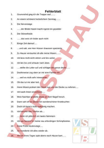 Fehlerblatt 1. Grummelnd ging ich die Treppe rauf 2. An einem schönem herbstlichem Sonntag 3. Die Nervensäge 4. .der Blöde Hansli macht irgend ein gepolder 5. Der Störenfriede 6. .das weis ich leider auch nicht 7. Einige Zeit darrauf. 8. und sah, wie Herr Hüsser draussen spatzierte 9. Zu Hause verräumte ich alle meine Waren 10. Ich liess mich nicht stören und lies weiter. 11. Ich lies los und schaute nach oben. 12. .stellte die Leiter auf und schlägte die ganze decke 13. Dooferweise zog oben an mir eine Familie ein 14. .weil es mich sehr intressierte. 15. Oh das tut mir aber leid 16. Herrn Wüest probiert den Stock nun von der Decke zu nehmen. 17. Ich kaufe ihnen einenStock. 18. Mein Nachbar grübelte etwas an dem Nagel herum. 19. Dann sah ich an Decke ein wunderschöner Kronleuchter. 20. Doch ich kanns nicht rückgenig machen. 21. Ich hänckte das Telefon ab 22. .hörte ich plötzlich ein lautes hämmern 23. Ich war berümt für meine neu erfundnigen Schimpfwörter. 24. Diese Poltik heutezutags. 25. So mondierte ich alles wieder ab. 26. Als ich eines Tages spät abens nach Hause kam