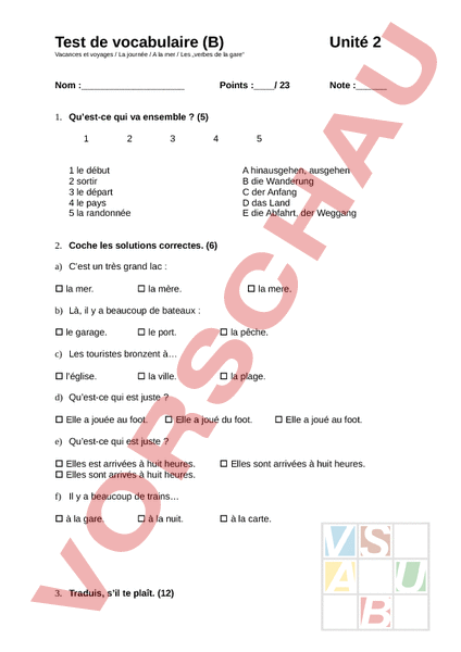 Test de vocabulaire (B) Unité 2 Vacances et voyages La journée A la mer Les „verbes de la gare Nom : Points :/ 23 Note : 1. Quest-ce qui va ensemble (5) 1 2 3 4 1 le début 2 sortir 3 le départ 4 le pays 5 la randonnée 5 hinausgehen, ausgehen die Wanderung der Anfang das Land die Abfahrt, der Weggang 2. Coche les solutions correctes. (6) a) Cest un très grand lac la mer. la mère. la mere. b) Là, il a beaucoup de bateaux le garage. le port. la pêche. c) Les touristes bronzent à léglise. la ville. la plage. d) Quest-ce qui est juste Elle jouée au foot. Elle joué du foot. Elle joué au foot. e) Quest-ce qui est juste Elles est arrivées à huit heures. Elles sont arrivés à huit heures. Elles sont arrivées à huit heures. f) Il a beaucoup de trains à la gare. à la nuit. 3. Traduis, sil te plaît. (12) à la carte. a) heute b) um Mitternacht c) der Spaziergang d) le sable e) lintérieur nager f) g) Avant le voyage, on fait ses bagages. h) midi, on est à Nantes. i) Ce bateau va à la pêche. Tes efforts selon le point de vue de ton professeur: Superbe! Tu as travaillé intensément. Bravo! K Avertissement: Tu as travaillé, sans doute. Peut – être tu dois travailler plus régulièrement. Tu as bien travaillé, mais plus dengagement est possible. L Alerte: Montre tes préparations au professeur!