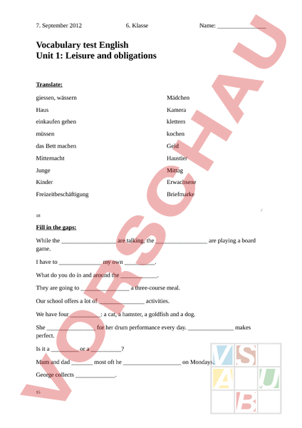 7. September 2012 6. Klasse Name: Vocabulary test English Unit 1: Leisure and obligations Translate: giessen, wässern Mädchen Haus Kamera einkaufen gehen klettern müssen kochen das Bett machen Geld Mitternacht Haustier Junge Mittag Kinder Erwachsene Freizeitbeschäftigung Briefmarke 18 Fill in the gaps: While the are talking, the are playing board game. have to my own . What do you do in and around the . They are going to three-course meal. Our school offers lot of activities. We have four : cat, hamster, goldfish and dog. She for her drum performance every day. makes perfect. Is it or ? Mum and dad most oft he on Mondays. George collects. 15 Points: /33P. Signature: Comments: