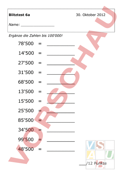 Arbeitsblatt: Blitztest 6a Ergänze bis 100'000 4 Kl.