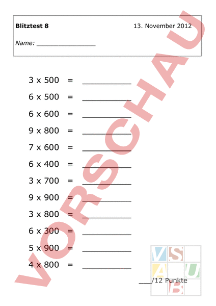 Blitztest 8 13. November 2012 Name: 3 500 6 500 6 600 9 800 7 600 6 400 3 700 9 900 3 800 6 300 5 900 4 800/12 Punkte Blitztest 8 Lösung 1500 3000 3600 7200 4200 2400 2100 8100 2400 1800 4500 3200 13. November 2012