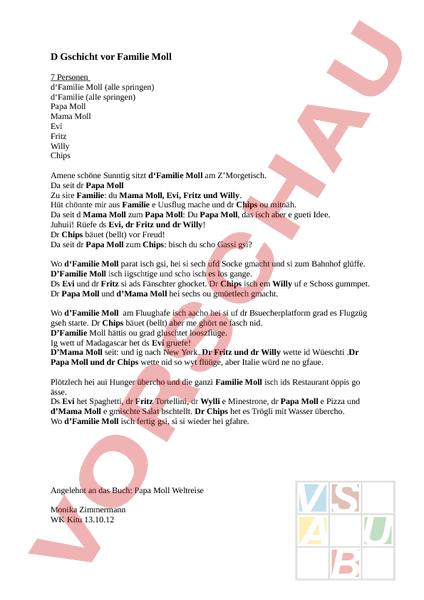 D Gschicht vor Familie Moll 7 Personen d‘Familie Moll (alle springen) d‘Familie (alle springen) Papa Moll Mama Moll Evi Fritz Willy Chips Amene schöne Sunntig sitzt d‘Familie Moll am ZMorgetisch. Da seit dr Papa Moll Zu sire Familie: du Mama Moll, Evi, Fritz und Willy. Hüt chönnte mir aus Familie Uusflug mache und dr Chips ou mitnäh. Da seit Mama Moll zum Papa Moll: Du Papa Moll, das isch aber gueti Idee. Juhuii! Rüefe ds Evi, dr Fritz und dr Willy! Dr Chips bäuet (bellt) vor Freud! Da seit dr Papa Moll zum Chips: bisch du scho Gassi gsi? Wo d‘Familie Moll parat isch gsi, hei si sech ufd Socke gmacht und si zum Bahnhof glüffe. DFamilie Moll isch iigschtige und scho isch es los gange. Ds Evi und dr Fritz si ads Fänschter ghocket. Dr Chips isch em Willy uf Schoss gummpet. Dr Papa Moll und dMama Moll hei sechs ou gmüetlech gmacht. Wo dFamilie Moll am Fluughafe isch aacho hei si uf dr Bsuecherplatform grad es Flugzüg gseh starte. Dr Chips bäuet (bellt) aber me ghört ne fasch nid. DFamilie Moll hättis ou grad gluschtet looszflüge. Ig wett uf Madagascar het ds Evi gruefe! DMama Moll seit: und ig nach New York. Dr Fritz und dr Willy wette id Wüeschti .Dr Papa Moll und dr Chips wette nid so wyt flüüge, aber Italie würd ne no gfaue. Plötzlech hei aui Hunger übercho und die ganzi Familie Moll isch ids Restaurant öppis go ässe. Ds Evi het Spaghetti, dr Fritz Tortellini, dr Wylli Minestrone, dr Papa Moll Pizza und dMama Moll gmischte Salat bschtellt. Dr Chips het es Trögli mit Wasser übercho. Wo dFamilie Moll isch fertig gsi, si si wieder hei gfahre. Angelehnt an das Buch: Papa Moll Weltreise Monika Zimmermann WK Kitu 13.10.12