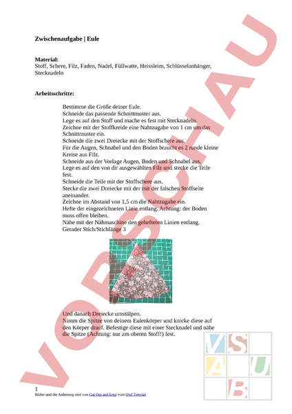 Zwischenaufgabe Eule Material: Stoff, Schere, Filz, Faden, Nadel, Füllwatte, Heissleim, Schlüsselanhänger, Stecknadeln Arbeitsschritte: Bestimme die Größe deiner Eule. Schneide das passende Schnittmuster aus. Lege es auf den Stoff und mache es fest mit Stecknadeln. Zeichne mit der Stoffkreide eine Nahtzugabe von 1 cm um das Schnittmuster ein. Schneide die zwei Dreiecke mit der Stoffschere aus. Für die Augen, Schnabel und den Boden braucht es 2 runde kleine Kreise aus Filz. Schneide aus der Vorlage Augen, Boden und Schnabel aus. Lege es auf den von dir ausgewählten Filz und stecke die Teile fest. Schneide die Teile mit der Stoffschere aus. Stecke die zwei Dreiecke mit der mit der falschen Stoffseite aneinander. Zeichne im Abstand von 1,5 cm die Nahtzugabe ein. Hefte der eingezeichneten Linie entlang. Achtung: der Boden muss offen bleiben. Nähe mit der Nähmaschine den gehefteten Linien entlang. Gerader Stich/Stichlänge 3 Und danach Dreiecke umstülpen. Nimm die Spitze von deinem Eulenkörper und knicke diese auf den Körper drauf. Befestige diese mit einer Stecknadel und nähe die Spitze (Achtung: nur am oberen Stoff!) fest. 1 Bilder und die Anleitung sind von Cut Out and keep vom Owl Tutorial Nimm deine Füllwatte und stopfe die Eule. In den Schnabel darf bzw. sollte nichts hineinkommen, aber in den Kopf. Wenn es etwas schwierig ist, dann nehmt einfach einen Stift. Damit kommt man am besten in die Lücken. Nimm einen Heftfaden und hefte in einer Linie am Boden entlang. Siehe Bild unten. Der Faden sollte jetzt am Anfang und am Ende gleich raus hängen, damit das untere der Eule gut verschließbar ist. Zieh vorsichtig an den beiden Fäden, bis der Stoff sich zusammenrafft. Danach gut verknoten. Klebe mit Heissleim die Augen und der Boden an. Nähe den Schnabel an. Zum Schluss kannst du noch einen Schlüsselanhänger an deine Eule annähen. 2 Viel Spass 3 Bilder und die Anleitung sind von Cut Out and keep vom Owl Tutorial