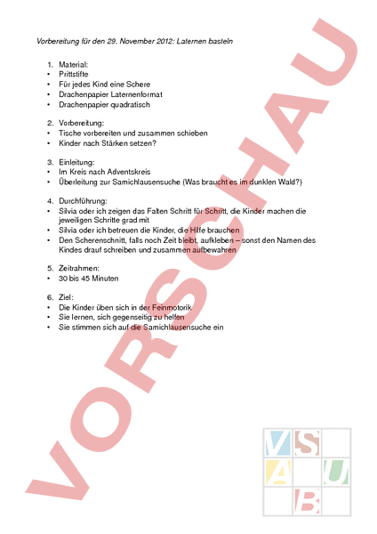 Vorbereitung für den 29. November 2012: Laternen basteln 1. • • • • Material: Prittstifte Für jedes Kind eine Schere Drachenpapier Laternenformat Drachenpapier quadratisch 2. Vorbereitung: • Tische vorbereiten und zusammen schieben • Kinder nach Stärken setzen? 3. Einleitung: • Im Kreis nach Adventskreis • Überleitung zur Samichlausensuche (Was braucht es im dunklen Wald?) 4. Durchführung: • Silvia oder ich zeigen das Falten Schritt für Schritt, die Kinder machen die jeweiligen Schritte grad mit • Silvia oder ich betreuen die Kinder, die Hilfe brauchen • Den Scherenschnitt, falls noch Zeit bleibt, aufkleben – sonst den Namen des Kindes drauf schreiben und zusammen aufbewahren 5. Zeitrahmen: • 30 bis 45 Minuten 6. • • • Ziel: Die Kinder üben sich in der Feinmotorik Sie lernen, sich gegenseitig zu helfen Sie stimmen sich auf die Samichlausensuche ein