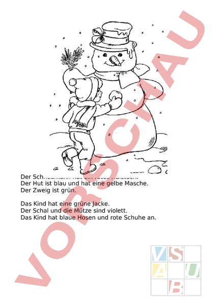 Der Schneemann hat ein rotes Halstuch. Der Hut ist blau und hat eine gelbe Masche. Der Zweig ist grün. Das Kind hat eine grüne Jacke. Der Schal und die Mütze sind violett. Das Kind hat blaue Hosen und rote Schuhe an.
