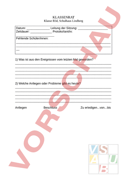 KLASSENRAT Klasse B3d, Schulhaus Lindberg Datum: Leitung der Sitzung: Zeitdauer: Protokollant/in: Fehlende Schüler/innen: 1) Was ist aus den Ereignissen vom letzten Mal geworden? 2) Welche Anliegen oder Probleme gibt es heute? Anliegen Beschluss Zu erledigen.von.bis