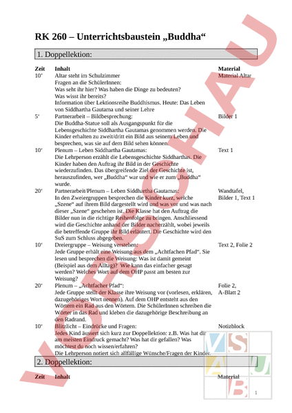 RK 260 – Unterrichtsbaustein „Buddha 1. Doppellektion: Zeit 10 5‘ 10‘ 20‘ 10‘ 20‘ 10‘ Inhalt Altar steht im Schulzimmer Fragen an die SchülerInnen: Was seht ihr hier? Was haben die Dinge zu bedeuten? Was wisst ihr bereits? Information über Lektionsreihe Buddhismus. Heute: Das Leben von Siddhartha Gautama und seiner Lehre Partnerarbeit – Bildbesprechung: Die Buddha-Statue soll als Ausgangspunkt für die Lebensgeschichte Siddhartha Gautamas genommen werden. Die Kinder erhalten zu zweit/dritt ein Bild aus seinem Leben und besprechen, was sie auf dem Bild sehen können. Plenum – Leben Siddhartha Gautamas: Die Lehrperson erzählt die Lebensgeschichte Siddharthas. Die Kinder haben den Auftrag ihr Bild in der Geschichte wiederzufinden. Das übergreifende Ziel der Geschichte ist, herauszufinden, wer „Buddha war und wie er zum „Buddha wurde. Partnerarbeit/Plenum – Leben Siddhartha Gautamas: In den Zweiergruppen besprechen die Kinder kurz, welche „Szene auf ihrem Bild dargestellt wird und was vor und was nach dieser „Szene geschehen ist. Die Klasse hat den Auftrag die Bilder nun in die richtige Reihenfolge zu bringen. Anschliessend wird die Geschichte anhand der Bilder nacherzählt, wobei jeweils die betreffende Gruppe ihr Bild erläutert. Die Geschichte wird den SuS zum Schluss abgegeben. Dreiergruppe – Weisung verstehen: Jede Gruppe erhält eine Weisung aus dem „Achtfachen Pfad. Sie lesen und besprechen die Weisung: Was ist damit gemeint (Beispiel aus dem Alltag)? Wie kann das einfacher gesagt werden? Welches Wort auf dem OHP passt am besten zur Weisung? Plenum – „Achtfacher Pfad: Jede Gruppe stellt der Klasse ihre Weisung vor (vorlesen, erklären, dazugehöriges Wort nennen). Auf dem OHP entsteht aus den Wörtern ein Rad aus den Wörtern. Die SchülerInnen schreiben die Wörter in das Rad und kleben die dazugehörige Beschreibung an den Radrand. Blitzlicht – Eindrücke und Fragen: Jedes Kind äussert sich kurz zur Doppellektion: z.B. Was hat dir am meisten Eindruck gemacht? Was hat dir gefallen? Was möchtest du noch wissen/erfahren? Die Lehrperson notiert sich allfällige Wünsche/Fragen der Kinder. Material Material Altar Bilder 1 Text 1 Wandtafel, Bilder 1, Text 1 Text 2, Folie 2 Folie 2, A-Blatt 2 Notizblock 2. Doppellektion: Zeit Inhalt Material 1 10‘ 10‘ 10 30‘ 15‘ 15 Repetition – Leben Siddhartha Gautamas: Die SchülerInnen versuchen einzeln oder zu zweit die Fragen des Kreuzworträtsels zur vergangenen Doppellektion zu beantworten. Dabei dürfen sie die Unterlagen verwenden. Plenumsauswertung: Mündliche Auswertung des Kreuzworträtsels. Plenum – Buddha-Statuen betrachten: Zu zweit, dann im Plenum betrachten die SchülerInnen verschiedene Buddha-Statuen, beschreiben, vergleichen miteinander und stellen auf diese Weise Unterschiede und Gemeinsamkeiten sowie Auffälliges fest. Gruppenarbeit – Buddha-Statue: Heute werden wir uns die Buddha-Statue noch etwas genauer anschauen. Dazu arbeitet ihr zu dritt in „Expertengruppen, wobei immer zwei Dreiergruppen denselben Text bekommen: Füsse Hände Gesicht Aussehen Auftrag: 1. Jeder liest für sich den Text. 2. Besprecht in eurer Dreiergruppe: Was haben wir gelesen? Gibt es Dinge, die wir nicht verstehen? 3. Was sind die wichtigsten Aussagen des Textes? Einigt euch auf drei bis fünf wichtige Wörter und markiert diese im Text! 4. Überlegt, wie ihr den anderen SchülerInnen mit Hilfe des Bildes das Gelesene erklären wollt. Schreibt die markierten Wörter zu eurem Bild 5. Jeder übt das Erklären nur anhand des beschrifteten Bildes. Gruppenpuzzle – Buddha-Statue: Bildet Vierergruppen, sodass aus jeder Expertengruppe jemand vertreten ist. Erklärt einander, was man an der Buddha-Statue alles erkennen kann. Jedes Kind vervollständigt die Beschriftung der Buddha-Statue (3-5 Wörter pro „Thema). Ausblick nächste Woche – Leben als Buddhist: Nächstes Mal befassen wir uns mit dem Alltag von Buddhistinnen und Buddhisten. Notiert zu zweit fünf Fragen zu den Bildern (1 Frage/Zettel)! Befestigt sie an der Wandtafel. Fragen werden in der Klasse besprochen, evt, zusammengeführt oder aussortiert. Teilt euch bis max. 4 Personen einer Frage zu. Auftrag auf nächste Lektion: Sucht Informationen zu eurer Frage (Tipp: Im Internet, Fachliteratur, Verwandte, Freunde, Umgebung) - Notizen und Fotos, und bringt sie in die nächste Lektion mit. A-Blatt 3 A-Blatt 3 (Lösungsfolie) Bilder 4 (Bilder Texte 4, A-Blatt 4 A-Blatt 4 Folie 5, Zettel, Fragepronomen an WT 3. Doppellektion: Zeit 45 Inhalt Auftrag: 1. Tragt eure Informationen in der Gruppe zusammen 2. Sucht weitere Antworten auf eure Frage (im Internet, Material Notizheft, Zettel, A2 2 15 10‘ Fachliteratur) und 3. Erstellt ein Plakat A2, auf dem ihr eure Erkenntnisse und neues Wissen informativ darstellt. Verwendet Bilder, Texte, Karten, Darstellungen SchülerInnen arbeiten in der Gruppe am Plakat. Die Poster werden als „Marktplatz präsentiert: Poster Es bleibt jeweils mind. eine Person der Gruppe beim Plakat und gibt „Standbesucher Auskunft über ihr Plakat. Ziel: Für Filme Informationen sammeln Informiert euch über die Aspekte des Buddhismus, damit ihr sie danach in den Portraits erkennen und euch darüber austauschen könnt. 2 Portrait anschauen: Beamer, PC, Kalsang Dorjee Lhaning und Shak-Dagsay: Porträts über die beiden Portraits Tibeter geben Einblick in den buddhistischen Glauben. (Kalsang Dorjee Lhaning) (Shak-Dagsay) 10 5‘ Besprechen im Plenum: Was wurde entdeckt? Wurden Unterschiede zu euren Informationen entdeckt? Bestehen noch Fragen welche Experten von anderen Aspekten beantworten müssten? Ausblick Prüfung Lernziele: Du weißt was der achtfache Pfad bedeutet. Du kennst eine Weisheit des achtfachen Pfades erläutern. Du kennst die Lebensgeschichte von Siddhartha Gautama. Du kannst einige Merkmale der Buddhastatue erklären. Du kannst über einen Aspekt des Buddhismus im Alltag ausführlicher berichten (z.B.: Mandalas, Geb