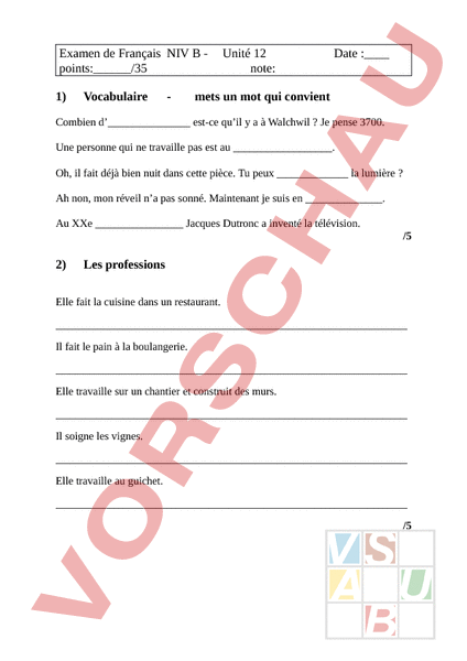 Examen de Français NIV points:/35 1) Vocabulaire Unité 12 note: Date : mets un mot qui convient Combien d_ est-ce quil a à Walchwil Je pense 3700. Une personne qui ne travaille pas est au . Oh, il fait déjà bien nuit dans cette pièce. Tu peux la lumière Ah non, mon réveil na pas sonné. Maintenant je suis en . Au XXe Jacques Dutronc inventé la télévision. /5 2) Les professions Elle fait la cuisine dans un restaurant. Il fait le pain à la boulangerie. Elle travaille sur un chantier et construit des murs. Il soigne les vignes. Elle travaille au guichet. /5 3) pouvoir savoir Je lire, parce que la lampe ne fonctionne pas. Elle faire du ski. Le cinéma est fermé, vous aller. Quand les enfants dorment, elle lire un livre. Est-ce que tu jouer au piano Silvie parler lAnglais parce quelle habité en Amérique. Enfin je aller nager, car la piscine est ouverte Frédo bien jouer au foot parce quil sentraîne trois fois par semaine. /8 4) les négations a) Est-ce que tu penses souvent à lécole Non, je b) Est-ce que Philip joue encore au foot Non, il c) Est-ce quil fait froid dehors Non, il d) Est-ce quelle dit quelque chose Non, elle e) Est-ce que vous écrivez à quelquun Non, nous /5 5) limparfait 1. Je une eau minérale. (prendre) 2. Mes frères notre père. (aider) 3. Nous n. pas beaucoup dargents. (avoir) 4. Elle à pied à lécole. (aller) 5. Tu dans la même chambre que ton frère (dormir) 6. Il une longue lettre. (écrire) 7. La fille ne pas. (skier) 8. Vous . les devoirs après lécole (faire) 9. Mes parents des paysans. (être) 10. Je mes nouvelles chaussures. (mettre) 11. Le train . à dix heures. (partir) 12. Je très tôt le matin. (se lever) /12