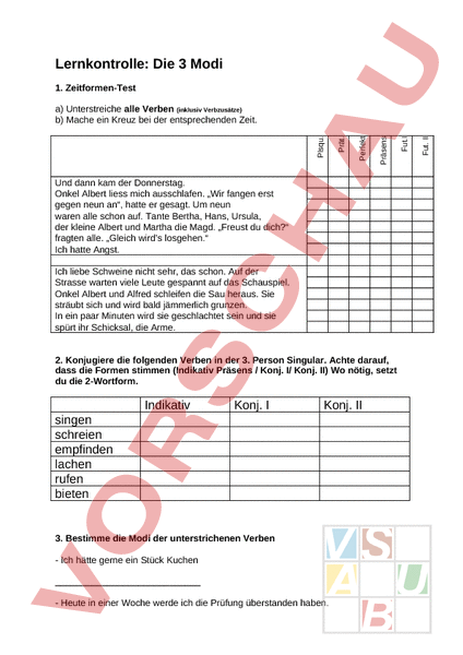 Lernkontrolle: Die 3 Modi 1. Zeitformen-Test Und dann kam der Donnerstag. Onkel Albert liess mich ausschlafen. „Wir fangen erst gegen neun an, hatte er gesagt. Um neun waren alle schon auf. Tante Bertha, Hans, Ursula, der kleine Albert und Martha die Magd. „Freust du dich? fragten alle. „Gleich wirds losgehen. Ich hatte Angst. Ich liebe Schweine nicht sehr, das schon. Auf der Strasse warten viele Leute gespannt auf das Schauspiel. Onkel Albert und Alfred schleifen die Sau heraus. Sie sträubt sich und wird bald jämmerlich grunzen. In ein paar Minuten wird sie geschlachtet sein und sie spürt ihr Schicksal, die Arme. 2. Konjugiere die folgenden Verben in der 3. Person Singular. Achte darauf, dass die Formen stimmen (Indikativ Präsens Konj. I/ Konj. II) Wo nötig, setzt du die 2-Wortform. Indikativ Konj. Konj. II singen schreien empfinden lachen rufen bieten 3. Bestimme die Modi der unterstrichenen Verben Ich hätte gerne ein Stück Kuchen Heute in einer Woche werde ich die Prüfung überstanden haben. Fut. II Fut.I Präsens Perfekt Prät. Plsqu. a) Unterstreiche alle Verben (inklusiv Verbzusätze) b) Mache ein Kreuz bei der entsprechenden Zeit. Susi hat gut gesungen. Schwimm nicht zu weit hinaus! Ich dachte, er sei in Amerika. 4. Setze den Satz in die indirekte Rede Er sagt: „Ich trage die Koffer zum Bahnhof. Die Nachbarin fragt: „ Wann kommen die neuen Einwohner? Sie erklärt: „ Er hat hohes Fieber. Die Schüler behaupten: „Wir wissen alles. Susanne schimpft: „Ich muss noch üben. -Philip meint: „ Die Kinder lachen bestimmt über mich. Lernkontrolle: Die 3 Modi 1. Zeitformen-Test Und dann kam der Donnerstag. Onkel Albert liess mich ausschlafen. „Wir fangen erst gegen neun an, hatte er gesagt. Um neun waren alle schon auf. Tante Bertha, Hans, Ursula, der kleine Albert und Martha die Magd. „Freust du dich? fragten alle. „Gleich wirds losgehen. Ich hatte Angst. Ich liebe Schweine nicht sehr, das schon. Auf der Strasse warten viele Leute gespannt auf das Schauspiel. Onkel Albert und Alfred schleifen die Sau heraus. Sie sträubt sich und wird bald jämmerlich grunzen. In ein paar Minuten wird sie geschlachtet sein und sie spürt ihr Schicksal, die Arme. X Fut. II Fut.I Präsens Perfekt Prät. Plsqu. a) Unterstreiche alle Verben (inklusiv Verbzusätze) b) Mache ein Kreuz bei der entsprechenden Zeit. X X X X X /10 2. Konjugiere die folgenden Verben in der 3. Person Singular. Achte darauf, dass die Formen stimmen (Indikativ Konj. I/ Konj. II) Wo nötig, setzt du die 2-Wortform. singen Indikativ singt Konj. singe Konj. II sänge schreien schreit schreie schriee empfinden empfindet empfinde empfände lachen lacht lache rufen ruft rufe lachte würde lachen riefe bieten bietet biete böte würde bieten /6 3. Bestimme die Modi der unterstrichenen Verben Ich hätte gerne ein Stück Kuchen Konj. II Heute in einer Woche werde ich die Prüfung überstanden haben. Ind. Fut. II Susi hat gut gesungen. Ind. Perf. Schwimm nicht zu weit hinaus! Imperativ Ich dachte, er sei in Amerika. Konj. /5 4. Setze den Satz in die indirekte Rede Er sagt: „Ich trage die Koffer zum Bahnhof. Er sagt, er trage die Koffer zum Bahnhof. Die Nachbarin fragt: „ Wann kommen die neuen Einwohner? Die Nachbarin fragt, wann die Einwohner kämen. Sie erklärt: „ Er hat hohes Fieber. Sie erklärt, er habe hohes Fieber. Die Schüler behaupten: „Wir wissen alles. Die Schüler behaupten, sie wüssten alles. Susanne schimpft: „Ich muss noch üben. Susanne schimpft, sie müsse noch üben. -Philip meint: „ Die Kinder lachen bestimmt über mich. Philip meint, die Kinder würden bestimmt über ihn lachen. /6 Ich liebe Schweine nicht sehr, das schon. Auf der Strasse warten viele Leute gespannt auf das Schauspiel. Onkel Albert und Alfred schleifen die Sau heraus. Sie sträubt sich und wird bald jämmerlich grunzen. In ein paar Minuten wird sie geschlachtet sein und sie spürt ihr Schicksal, die Arme. Fut. II Fut.I Präsens Perfekt Prät. Plsqu. Und dann kam der Donnerstag. Onkel Albert liess mich ausschlafen. „Wir fangen erst gegen neun an, hatte er gesagt. Um neun waren alle schon auf. Tante Bertha, Hans, Ursula, der kleine Albert und Martha die Magd. „Freust du dich? fragten alle. „Gleich wirds losgehen. Ich hatte Angst. X X X X X X
