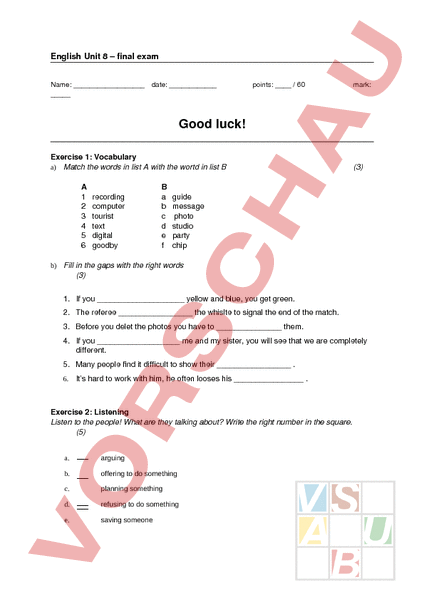 English Unit 8 – final exam Name: date: points: 60 mark: Good luck! Exercise 1: Vocabulary a) Match the words in list with the wortd in list A 1 2 3 4 5 6 recording computer tourist text digital goodby a c e (3) guide message photo studio party chip b) Fill in the gaps with the right words (3) 1. If you yellow and blue, you get green. 2. The referee the whislte to signal the end of the match. 3. Before you delet the photos you have to them. 4. If you me and my sister, you will see that we are completely different. 5. Many people find it difficult to show their 6. Its hard to work with him, he often looses his Exercise 2: Listening Listen to the people! What are they talking about? Write the right number in the square. (5) a. arguing b. offering to do something c. planning something d. refusing to do something e. saving someone Exercise 3: Reading Read the text and do the exercise! investigated covered orphan ermitteln untersuchen bedeckt Waisenkind (6) to raise money Geld auftreiben charity Almosen wohltätige Zwecke Read the statements and decide if they are true (T) or false (F). Correct the false ones! 1. There are many rich people in the East End of London. 2. Cockneys are pople who are born anywhere in London. 3. The first Pearly King was little boy called Henry Croft. 4. Pearly Kings and Queens are very rich and give money to charity. 5. Henry raised lot of money for charity. 6. You can see all the Pearly Kings and Queens in Trafalgar Square in October and May. Exercise 4: Infinitive of purpose a) Read the sentences and make one sentence with an infinitive of purpose. (7) 1. Paul did some exercises. He wanted to lose weight. 2. Shes gone to the supermarket. She needs to buy some sugar. 3. Daisy wants to become doctor. She is studying hard. 4. They want to buy new boots. So they have gone to town. 5. We are on diet. We want to get thinner. 6. phoned my grandparents last night. wanted to invite them to our Christmas dinner. 7. My mother wants to celebrate my birthday. She is organising party. b) Finish the sentence by using positive or negative infinitive of purpose. (8) 1. carry my umbrella 2. Sally wears thick pullover 3. My sister forgot 4. Its not fun 5. Ben studys English 6. People eat healthy food 7. went to the supermarket 8. wear helmet Exercise 5: Open Conditional a) Make an open conditional by using the words given! (8) 1. go /beach/ rain/not 2. Cold/ wear/ coat 3. Eat/ too much/ get/ fat 4. wear/ sunscreen/ sunny 5. Dog/ happy/ wags/ tail 6. Drink/too much/ coffee/ get/ headache 7. teacher/ gets/ angry/ not/ speak/ English 8. get good/ grades/ do/ homework b) Make open conditionals by using this feelings! angry hungry lonely sleepy (5) nervous 1. 2. 3. 4. 5. Exercise 6: question tags a) Underline the right answer! (7) Shes very late, Sally cant swim, They were in New York, Paul worked for long time, They wouldnt like the drink, Well have to hurry, Mary doesnt know Im here, isnt she? doesnt she? wasnt he? doesnt he? is she? can she? arent they? did he? hasnt she? cant she? werent they? was he? has she? is she? were they? didnt he? dont they? wont we? am I? wont they? dont we? does she? would they? will we? do I? did they? arent we? dont I? b) Fill in the right question tag! Most people dont like vegetables, Students mustnt cheat in exams, Youd like to see it, You have only tea, They arrived yesterday, Youve heard about that, should visit her, He didnt have to speak to the teacher, (8)