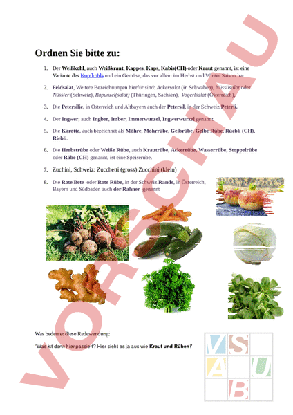 Ordnen Sie bitte zu: 1. Der Weißkohl, auch Weißkraut, Kappes, Kaps, Kabis(CH) oder Kraut genannt, ist eine Variante des Kopfkohls und ein Gemüse, das vor allem im Herbst und Winter Saison hat 2. Feldsalat, Weitere Bezeichnungen hierfür sind: Ackersalat (in Schwaben), Nüsslisalat oder Nüssler (Schweiz), Rapunzel(salat) (Thüringen, Sachsen), Vogerlsalat (Österreich),. 3. Die Petersilie, in Österreich und Altbayern auch der Petersil, in der Schweiz Peterli. 4. Der Ingwer, auch Ingber, Imber, Immerwurzel, Ingwerwurzel genannt. 5. Die Karotte, auch bezeichnet als Möhre, Mohrrübe, Gelbrübe, Gelbe Rübe, Rüebli (CH), Riebli. 6. Die Herbstrübe oder Weiße Rübe, auch Krautrübe, Ackerrübe, Wasserrübe, Stoppelrübe oder Räbe (CH) genannt, ist eine Speiserübe. 7. Zuchini, Schweiz: Zucchetti (gross) Zucchini (klein) 8. Die Rote Bete oder Rote Rübe, in der Schweiz Rande, in Österreich, Bayern und Südbaden auch der Rahner genannt Was bedeutet diese Redewendung: Was ist denn hier passiert? Hier sieht es ja aus wie Kraut und Rüben!