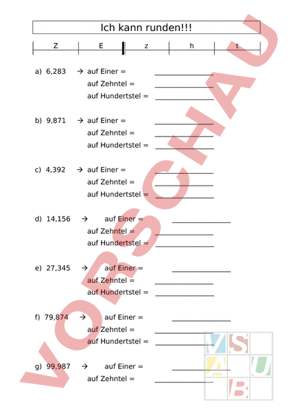Ich kann runden!!! a) 6,283 auf Einer auf Zehntel auf Hundertstel b) 9,871 auf Einer auf Zehntel auf Hundertstel c) 4,392 auf Einer auf Zehntel auf Hundertstel d) 14,156 auf Einer auf Zehntel auf Hundertstel e) 27,345 auf Einer auf Zehntel auf Hundertstel f) 79,874 auf Einer auf Zehntel auf Hundertstel g) 99,987 auf Einer auf Zehntel auf Hundertstel