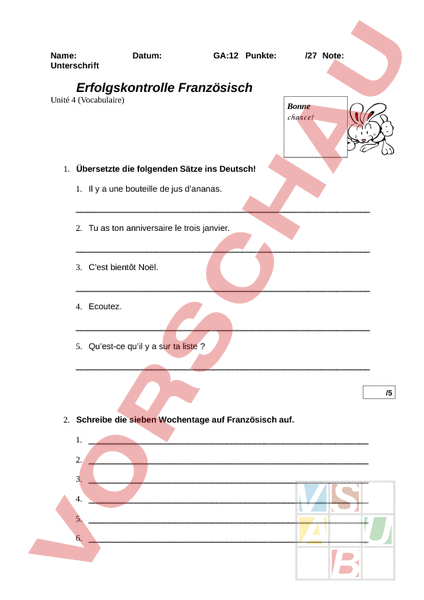 Name: Unterschrift Datum: GA:12 Punkte: /27 Note: Erfolgskontrolle Französisch Unité 4 (Vocabulaire) Bonne chance! 1. Übersetzte die folgenden Sätze ins Deutsch! 1. Il a une bouteille de jus dananas. 2. Tu as ton anniversaire le trois janvier. 3. Cest bientôt Noël. 4. Ecoutez. 5. Quest-ce quil a sur ta liste /5 2. Schreibe die sieben Wochentage auf Französisch auf. 1. 2. 3. 4. 5. 6. /7 3. Schreibe die gehörten Zahlen auf. 1. 2. 3. 4. /5 4. Ergänze die Tabelle. janvier octobre mai août mars /7 5. Übersetze die folgenden Wörter ins Französische. 1. Welcher Tag ist es? 2. haben 3. dreissig /3