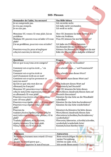 Ca SOS-‐ Phrases Demander de laide/ Au secours! Je ne comprends pas. Je nai pas compris. Je ne sais pas. Monsieur XY, venez sil vous plaît. Jai un problème. Madame XY, pouvez-‐vous maider sil vous plaît? Jai un problème, pourriez-‐vous maider? Pourriez-‐vous/tu peux mexpliquer cela/cet exercice/ce devoir/.? Questions Est-‐ce que tu as/vous avez compris? Comment est-‐ce quon écrit „. en français? Comment est-‐ce quon écrit ce mot?/Comment écrit-‐on ce mot? Comment est-‐ce quon prononce ce mot/ces mots? Quest-‐ce que cela veut dire en allemand/en français? Monsieur XY, pourriez-‐vous traduire cela/ce mot/cette expression/cette phrase en allemand sil vous plaît? Pourriez-‐vous écrire cela/. au tableau noir sil vous plaît? Pourriez-‐vous épeler cela/. sil vous plaît? Pourriez-‐vous répéter cela/. sil vous plaît? Pourrais-‐tu traduire/écrire/épeler/répéter cela/ce mot/cette expression/cette phrase, sil te plaît? Traduis/traduisez, écris/écrivez, répète/répétez sil te/vous plaît. Viens/venez ici sil vous plaît. Réponses Pardonnez/excusez mon retard sil vous plaît. Je suis en retard parce que . Je vais vous apporter le mot dexcuse Um Hilfe bitten Ich verstehe nicht. Ich habe nicht verstanden. Ich weiß es nicht. Herr XY, kommen Sie bitte hierher. Ich habe ein Problem. Frau XY, können Sie mir bitte helfen? Ich habe ein Problem, könnten Sie/könntet ihr mir helfen bitte? Können Sie/könntet ihr/könntest du mir bitte die Übung/diese Aufgabe erklären? Fragen Hast du/habt ihr verstanden? Wie schreibt man „. auf Französisch? Wie schreibt man dieses Wort? Wie spricht man dieses Wort aus? Was bedeutet dieses Wort auf Französisch/auf Deutsch? Herr XY, könnten Sie bitte dieses Wort/diesen Ausdruck/diesen Satz auf Deutsch übersetzen? Könnten Sie das bitte an die Wandtafel schreiben? Könnten Sie das bitte buchstabieren? Könnten Sie das bitte wiederholen? Könntest du/könnten Sie bitte dieses Wort/diesen Ausdruck/diesen Satz übersetzen/schreiben/buchstabieren/ wiederholen? Übersetzt/übersetze, schreibt/schreibe, wiederholt/wiederhole bitte! Kommt/komm hierher bitte! Antworten Bitte entschuldigen Sie/entschuldigt meine Verspätung. Ich bin zu spät, weil. Ich werde Ihnen meine Entschuldigung Ca aujourdhui/demain/après-‐demain/la semaine prochaine/lundi, mardi, mercredi, jeudi, vendredi. Jai une question. Cet exercice est trop facile/difficile pour moi/nous. Combien de temps avons-‐nous pour cet exercice/ce travail? Est-‐ce que je peux travailler avec . dans le couloir/dehors? Pardonnez-‐moi, je nai pas écouté/entendu, cest pour quand ces devoirs? Où est-‐ce que nous sommes? Je me suis complètement perdu(e), où sommes-‐nous? Jaimerais une feuille sil vous plaît. Jai besoin dune cartouche/des ciseaux/dune colle/dune gomme/dun effaceur/.? Est-‐ce que je peux avoir une feuille/un cahier/un papier/un crayon/une gomme/.? Est-‐ce que je peux aller aux toilettes sil vous plaît? Est-‐ce que je peux sortir, je vais mal, jai mal à la tête/au ventre/. heute/morgen/übermorgen/nächste Woche/am Montag/Dienstag/Mittwoch/Donnerstag/ Freitag bringen. Ich habe eine Frage. Diese Übung ist zu einfach/schwierig für mich/uns. Wie viel Zeit haben wir für diese Übung? Kann ich mit . draußen/im Gang arbeiten? Entschuldigen Sie bitte, ich habe nicht (zu)gehört, auf wann sind diese Hausaufgaben? Wo sind wir? Ich bin komplett verloren, wo sind wir? Ich hätte gerne ein Blatt. Ich brauche eine Schere/Leim/einen Radiergummi/einen Tintenkiller. Kann ich bitte ein Blatt/ein Heft/Papier/einen Bleistift/einen Gummi haben? Darf ich bitte auf die Toilette? Darf ich bitte nach draußen, mir gehts nicht gut. Ich habe Kopfschmerzen/Bauchschmerzen. Pour un bon travail Cest bien/très bien/excellent/parfait. Für gute Arbeit Das ist gut/sehr gut/ausgezeichnet/perfekt.