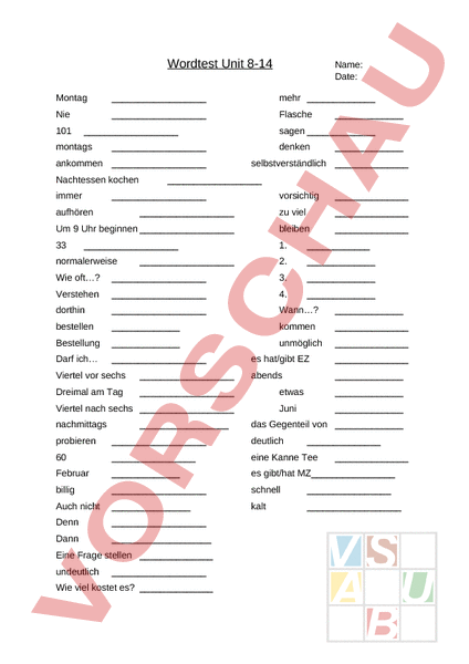 Wordtest Unit 8-14 Name: Date: Montag mehr Nie Flasche 101 montags Nachtessen kochen immer sagen ankommen denken selbstverständlich vorsichtig zu viel Um 9 Uhr beginnen bleiben 33 1. 2. aufhören normalerweise Wie oft? 3. Verstehen 4. dorthin Wann? bestellen kommen Bestellung unmöglich Darf ich Viertel vor sechs Dreimal am Tag es hat/gibt EZ abends Viertel nach sechs nachmittags etwas Juni das Gegenteil von probieren deutlich 60 eine Kanne Tee Februar es gibt/hat MZ billig schnell Auch nicht kalt Denn Dann Eine Frage stellen undeutlich Wie viel kostet es?