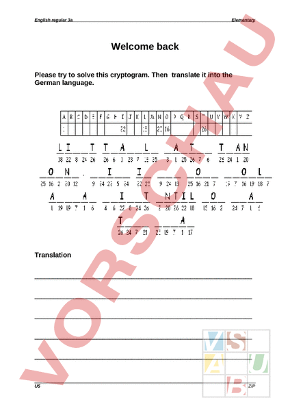 English regular 3a Elementary Welcome back Please try to solve this cryptogram. Then translate it into the German language. Translation U5 ZiP