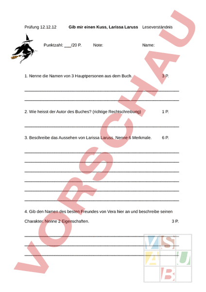 Prüfung 12.12.12 Gib mir einen Kuss, Larissa Laruss Punktzahl:/20 P. Note: Leseverständnis Name: 1. Nenne die Namen von 3 Hauptpersonen aus dem Buch. 3 P. 2. Wie heisst der Autor des Buches? (richtige Rechtschreibung) 1 P. 3. Beschreibe das Aussehen von Larissa Laruss. Nenne 6 Merkmale. 6 P. 4. Gib den Namen des besten Freundes von Vera hier an und beschreibe seinen Charakter. Nenne 2 Eigenschaften. 3 P. 5. Wie heisst Veras Stoffhase? 1 P. 6. Welches Problem gab es am ersten Abend mit dem Kühlschrank? 1 P. 7. Schreibe zwei Tricks auf, um Hexen zu verjagen. 2 P. 8. Beschreibe wie Vera es schafft vom Rummelplatz zu flüchten. 2 P. 9. Welche Geheimwaffe benützt Vera schliesslich, um die Larissa zu besiegen? 1 P.