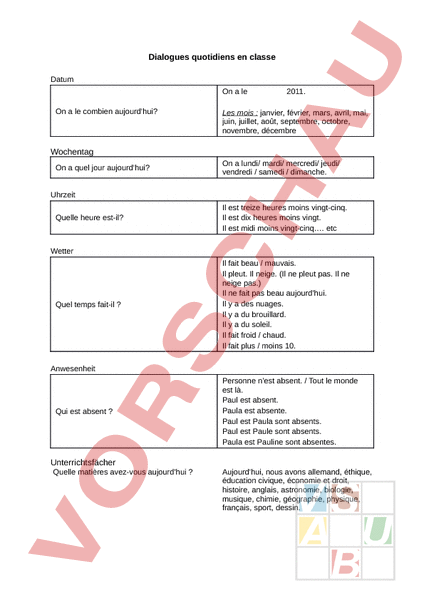 Dialogues quotidiens en classe Datum On le On le combien aujourdhui? 2011. Les mois janvier, février, mars, avril, mai, juin, juillet, août, septembre, octobre, novembre, décembre Wochentag On quel jour aujourdhui? On lundi/ mardi/ mercredi/ jeudi/ vendredi samedi dimanche. Uhrzeit Quelle heure est-il? Il est treize heures moins vingt-cinq. Il est dix heures moins vingt. Il est midi moins vingt-cinq. etc Wetter Quel temps fait-il Il fait beau mauvais. Il pleut. Il neige. (Il ne pleut pas. Il ne neige pas.) Il ne fait pas beau aujourdhui. Il a des nuages. Il a du brouillard. Il a du soleil. Il fait froid chaud. Il fait plus moins 10. Anwesenheit Qui est absent Personne nest absent. Tout le monde est là. Paul est absent. Paula est absente. Paul est Paula sont absents. Paul est Paule sont absents. Paula est Pauline sont absentes. Unterrichtsfächer Quelle matières avez-vous aujourdhui Aujourdhui, nous avons allemand, éthique, éducation civique, économie et droit, histoire, anglais, astronomie, biologie, musique, chimie, géographie, physique, français, sport, dessin.