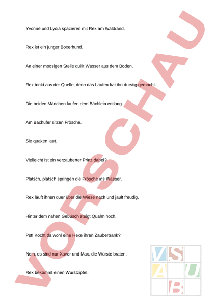 Yvonne und Lydia spazieren mit Rex am Waldrand. Rex ist ein junger Boxerhund. An einer moosigen Stelle quillt Wasser aus dem Boden. Rex trinkt aus der Quelle, denn das Laufen hat ihn durstig gemacht. Die beiden Mädchen laufen dem Bächlein entlang. Am Bachufer sitzen Frösche. Sie quaken laut. Vielleicht ist ein verzauberter Prinz dabei? Platsch, platsch springen die Frösche ins Wasser. Rex läuft ihnen quer über die Wiese nach und jault freudig. Hinter dem nahen Gebüsch steigt Qualm hoch. Pst! Kocht da wohl eine Hexe ihren Zaubertrank? Nein, es sind nur Xaver und Max, die Würste braten. Rex bekommt einen Wurstzipfel.