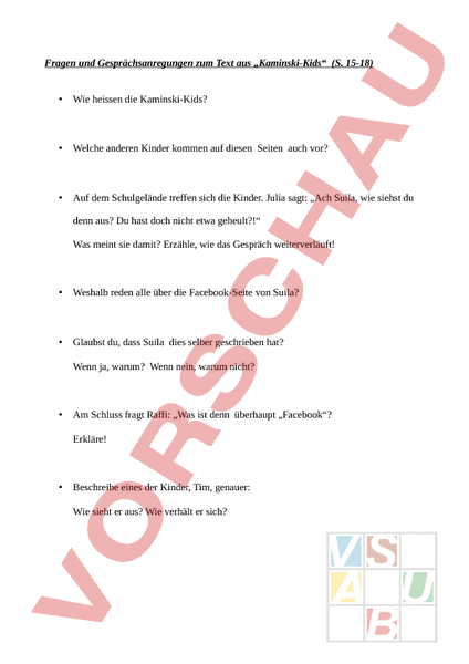 Fragen und Gesprächsanlässe zum Buch "Die Kaminski Kids, Gefährliches Spiel mit Facebook & Co." Seiten 15-18