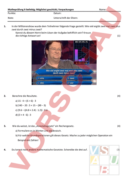 Arbeitsblatt: Matheprüfung X-beliebig; Möglichst geschickt; Verpackungen