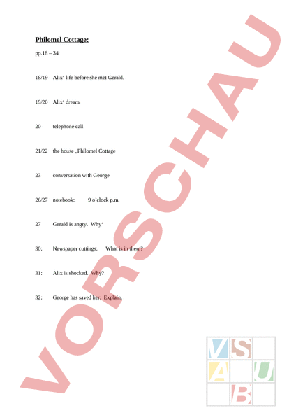 Philomel Cottage: pp.18 – 34 18/19 Alix‘ life before she met Gerald. 19/20 Alix‘ dream 20 telephone call 21/22 the house „Philomel Cottage 23 conversation with George 26/27 notebook: 9 oclock p.m. 27 Gerald is angry. Why‘ 30: Newspaper cuttings: 31: Alix is shocked. Why? 32: George has saved her. Explain. What is in them?