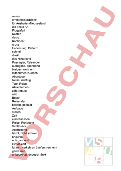 reisen umgangssprachlich für Australien/Neuseeland die beste Art Flugsafari Kosten riesig Kontinent gross Entfernung, Distanz schnell direkt das Hinterland Passagier, Reisender aufregend, spannend bleiben, wohnen mitnehmen zu/nach Abenteuer Reise, Ausflug Tour, Reise Allradantrieb zäh, robust wild Busch Reisender beliebt, populär Aufgabe stellen Zelt einschliessen Reise, Rundfahrt Schlafsack Ausrüstung leicht, nicht schwer bequem entspannend klimatisiert fahren, verkehren (laufen, rennen) geniessen unbegrenzt, unbeschränkt Abonnement, Fahrausweis kosten Bequemlichkeit, Komfort reserveiren lassen Schlafwagenplatz Speisewagen Büfettwagen Erfahrung, Erlebnis vergleichen teuer gewinnen Rekord Schwimmer Ureinwohner(in) Australiens Grönland Silbe Fluss Punkt, Stelle Meeresspiegel Veröffentlichen, herausgeben Küsser küssen stattfinden Vergleich Grönland Schulfach Person Eisenbahn hier: breit Einwohner Banane Lieblings-