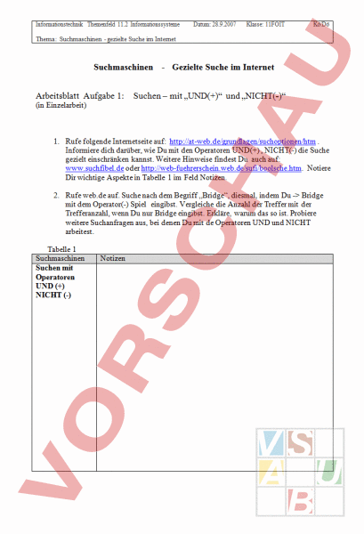 Informationstechnik Themenfeld 11.2 Informationssysteme Datum: 28.9.2007 Klasse: 11FOIT Kö/Dö Thema: Suchmaschinen gezielte Suche im Internet Suchmaschinen Gezielte Suche im Internet Arbeitsblatt Aufgabe 1: Suchen – mit „UND() und „NICHT(-) (in Einzelarbeit) 1. Rufe folgende Internetseite auf: Informiere dich darüber, wie Du mit den Operatoren UND() NICHT(-) die Suche gezielt einschränken kannst. Weitere Hinweise findest Du auch auf: www.suchfibel.de oder Notiere Dir wichtige Aspekte in Tabelle 1 im Feld Notizen. 2. Rufe web.de auf. Suche nach dem Begriff „Bridge, diesmal, indem Du - Bridge mit dem Operator(-) Spiel eingibst. Vergleiche die Anzahl der Treffer mit der Trefferanzahl, wenn Du nur Bridge eingibst. Erkläre, warum das so ist. Probiere weitere Suchanfragen aus, bei denen Du mit de Operatoren UND und NICHT arbeitest. Tabelle 1 Suchmaschinen Suchen mit Operatoren UND () NICHT (-) Notizen