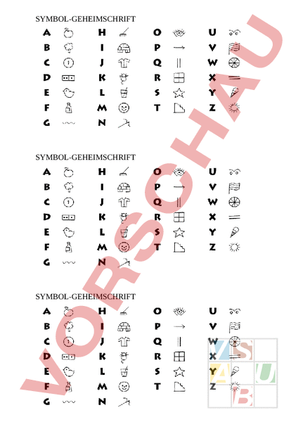 SYMBOL-GEHEIMSCHRIFT SYMBOL-GEHEIMSCHRIFT SYMBOL-GEHEIMSCHRIFT AUFFÜLL-SCHRIFT Zuerst schreibt man die Nachricht ganz normal auf ein Blatt Papier. Zum Beispiel: Treffen heute Nachmittag 10 Uhr! Allerdings lässt man zwischen den Buchstaben einen grösseren Abstand. Dann schreibt man in die Zwischenräume, respektive hinter jeden Buchstaben der Nachricht, einen beliebigen anderen Buchstaben. Das sähe dann so aus: Turlepfufcegnh hleiuttlep Nuatcphlmoiztgtdadgv 1e0k Umhfrj! WICHTIG: Es sollte nicht immer der gleiche Buchstabe gesetzt werden! ABC-SCHRIFT Als erstes schreibst du das ganze Alphabet in einer Reihe auf. Direkt darunter schreibst du das Alphabet nun beginnend mit auf: B D H Y W U S L Q N P R N L J V X G D Z A Das Beispielwort „GEHEIM würde in der ABCGeheimschrift so aussehen: „TVSVRN. Die richtigen Buchstaben werden einfach mit denen aus dem unteren Alphabet ersetzt. TINTENKILLER-GEHEIMSCHRIFT Du schreibst mit der weissen Seite eines Tintenkillers deine geheime Botschaft auf ein Blatt Papier. Natürlich kann man jetzt noch nichts lesen. Der Empfänger aber nimmt das scheinbar leere Blatt und fährt mit einem Füller oder mit Tinte über den unsichtbaren Text. Und schon wird er sichtbar. Die mit Tintenkiller geschriebenen Worte nehmen keine Tinte auf, aber das Papier drum herum. Deshalb erscheint die geheime Botschaft auch in weißer Schrift, während sich der Rest vom Papier natürlich blau verfärbt. SCHLANGEN-LATEIN Bei dieser Geheimschrift muss man den ersten Buchstaben eines Wortes an die letzte Stelle des Wortes hängen und dazu noch ein „ix anfügen. Der Name Lara würde dann so aussehen: araLix. Also heißt dieser Name in der Geheimschrift Aralix.