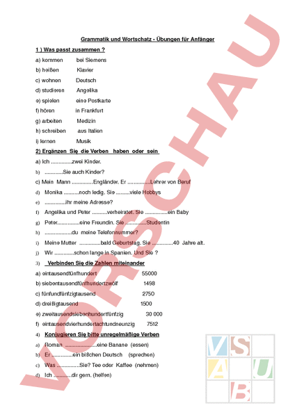 Grammatik und Wortschatz Übungen für Anfänger 1 Was passt zusammen a) kommen bei Siemens b) heißen Klavier c) wohnen Deutsch d) studieren Angelika e) spielen eine Postkarte f) hören in Frankfurt g) arbeiten Medizin h) schreiben aus Italien i) lernen Musik 2) Ergänzen Się die Verben haben oder sein a) Ich zwei Kinder. b) Sie auch Kinder? c) Mein Mann Engländer. Er .Lehrer von Beruf d) Monika noch ledig. Sie .viele Hobbys e) ihr meine Adresse? f) Angelika und Peter verheiratet. Sie .ein Baby g) Peter.eine Freundin. Sie Studentin h) du meine Telefonnummer? i) Meine Mutter bald Geburtstag. Sie 40 Jahre alt. j) Wir .schon lange in Spanien. Und Sie 3) Verbinden Się die Zahlen miteinander a) eintausendfünfhundert 55000 b) siebentausendfünfhundertzwölf 1498 c) fünfundfünfzigtausend 2750 d) dreißigtausend 1500 e) zweitausendsiebenhundertfünfzig 30 000 f) eintausendvierhundertachtundneunzig 7512 4) Konjugieren Się bitte unregelmäßige Verben a) Roman .eine Banane (essen) b) Er ein bißchen Deutsch c) (sprechen) Was .Sie? Tee oder Kaffee (nehmen) d) Ich dir gern. (helfen) e) du auch Arabisch? (sprechen)