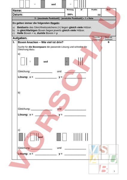 und Wertung Name: Datum: Punkte 200% Note /33 5 [maximale Punktzahl] [erreichte Punktzahl] 1 Note Es gelten immer die folgenden Regeln: a) Beidseits des Gleichheitszeichens () liegen gleich viele Hölzer. b) In gleichfarbigen Boxen liegen jeweils gleich viele Hölzer. c) Helle Boxen x, dunkle Boxen y Aufgaben: 1. Erreichte Punktzahl Boxen knacken – Wie viel ist drin? Maximale Punktzahl 6 Suche für die Boxenpaare die passende Lösung und schreibe die Gleichung dazu. a) und Gleichung: und Lösung: b) Gleichung: und Lösung: c) und Gleichung: und Lösung: 1 2. 3. Boxen füllen! Boxen, Tabelle und Gleichung einander zuordnen. 9 6 Jeweilsfür Suche eine dieGleichung, Boxenordnung eine Tabelle die passende und eineLösung Boxenanordnung und notiere sie in der Tabelle. gehören zusammen. SchreibeSchreibe zudem die dieGleichung Lösung indazu. die Lösungstabelle. a) Lösungstabelle: Gleichung Tabelle Anordnung 2. a) Tabelle: Beispiel y Gleichung: b) 2y 1 a) 0 Tabelle: 2 1 4 2 6 3 8 4 10 Gleichung: b) x 3 2 1 0 0 1 2 3 c) c) y 1 0 2 1 3 2 4 3 5 4 C 2x 2 2y y 3 Tabelle: 1. Gleichung: 2. 3. 2 4. Tabelle vervollständigen! 12 Ergänze in der folgenden Tabelle die fehlenden Angaben. Boxenordnung Gleichung Tabelle Text y 2 2y y y 0 3 1 4 y 2 5 3 6 In einer hellen und einer dunklen Box zusammen liegt 1 Hölzchen mehr, als in zwei hellen. Prüfungsbeurteilung: Schwierigkeitsgrad: einfach einfach – machbar machbar machbar – schwierig schwierig Zeitfaktor: zu wenig Zeit gehabt genügend Zeit gehabt zu viel Zeit gehabt Bemerkungen:. . . . . . . . Viel Erfolg! 3