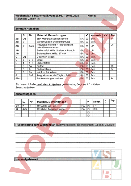 Wochenplan 1 Mathematik vom 16.08. – 20.08.2010 Natürliche Zahlen (4) Name:_ Zentrale Aufgaben S. Nr. ZB ZB 0/1 2 ZB 2 ZB Mathplan kennen lernen Sprechweisen und Heftführung Resultate ins Heft Pultnachbarn 1ac oder Eltern vorlesen Stellentafel, Hilfe: Stellent. Plättch Stufenzahlen, Hilfe: ST P Ü kennen lernen 78 Blitze 13 Stellentafeln 5a Ordne! 6 Stufenzahlen 7a Hüpf im Päckchen 78 Fragt einander ab! Täglich 5-10 Rückmeldung schreiben AB AB Ü Ü Ü Ü Ü Ü Plan 0/1 3 4 5 5 5 Material, Bemerkungen Kontrolle KA KA Sch. Sch. EA LP EA EA KA EA EA EA EA EA PA EA LP LP Sch. Sch. Sch. Sch. Sch. Sch. Sch. Sch. Tag Mo Di Mi Fr Fr Erst wenn ich die zentralen Aufgaben gelöst habe, beginne ich mit den Zusatzaufgaben. Zusatzaufgaben ZB Ü S. Nr. Material, Bemerkungen 2 45 3 Resultate ins Heft Restliche Aufgaben lösen EA EA Kontr. LP Sch. Tag Rückmeldung zum Wochenplan (Schwierigkeiten, Überlegungen,): min. 3 Sätze Hausaufgabenzeit Montag Dienstag Mittwoch Donnerstag Blitz 10 10 10 Freitag Total 30