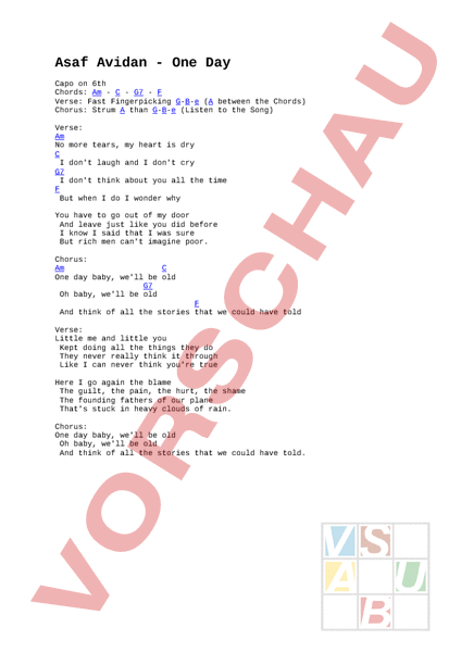 Asaf Avidan One Day Capo on 6th Chords: Am C G7 F Verse: Fast Fingerpicking G-B-e (A between the Chords) Chorus: Strum than G-B-e (Listen to the Song) Verse: Am No more tears, I dont laugh G7 dont think But when do my heart is dry and dont cry about you all the time wonder why You have to go out of my door And leave just like you did before know said that was sure But rich men cant imagine poor. Tab from: Chorus: Am One day baby, well be old G7 Oh baby, well be old And think of all the stories that we could have told Verse: Little me and little you Kept doing all the things they do They never really think it through Like can never think youre true Here go again the blame The guilt, the pain, the hurt, the shame The founding fathers of our plane That stuck in heavy clouds of rain. Chorus: One day baby, well be old Oh baby, well be old And think of all the stories that we could have told.