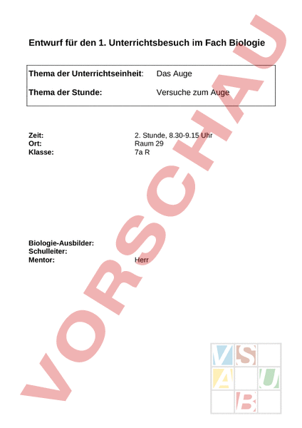 Entwurf für den 1. Unterrichtsbesuch im Fach Biologie Thema der Unterrichtseinheit: Das Auge Thema der Stunde: Versuche zum Auge Zeit: Ort: Klasse: 2. Stunde, 8.30-9.15 Uhr Raum 29 7a Biologie-Ausbilder: Schulleiter: Mentor: Herr Unterrichtsentwurf: Versuche zum Auge 1 Die Lerngruppe Mir ist es unter Vorbehalt möglich, innerhalb der kurzen Zeit den Lern- und Leistungsstand der Lerngruppe zu beurteilen. Die bisher gesehenen Leistungen sind sehr unterschiedlich und zeigen eine Heterogenität im Leistungsspektrum. Sitzplan Raum 29 Tafel 2 Unterrichtsentwurf: Versuche zum Auge 2 Verlaufsplan Zeit Phase Geplanter Unterrichtsverlauf 3 Begrüßung 7 Einstieg L. begrüßt die S. und stellt den Besuch vor. L. stellt Fragen zu Versuchen mit dem Auge. S. äußern Vermutungen. L. hält Abstimmung zu den Vermutungen an der Tafel fest. L: Diese Vermutungen wollen wir nun experimentell prüfen. Tafelanschrieb (Datum): Versuche zum Auge Erläuterungen zum Stationenlauf, Einteilung in Gruppen, Arbeitshinweise geben, Arbeitsblätter austeilen, S. gehen 3 Stationen durch. Für jede Station sind sieben Minuten vorgesehen. L. betreut bei Bedarf. (min) 3 Hinführung 21 Erarbeitun 10 Sicherung Vertiefung 1 HA L. vergleicht Ergebnisse der Experimente mit vorausgegangenen Vermutungen. Falls die Zeit reicht: Präsentation von Ergebnissen durch S. Kreuzworträtsel zur Nachbearbeitung Sozialform Medien L-S-Gespräch L-S-Gespräch Tafel L-Vortrag Tafel Arbeitsblätter Partnerarbeit Material zu den acht Lernstationen Tafel AB 3 Unterrichtsentwurf: Versuche zum Auge Hinweise für die Schüler: Geht zu den Tischen mit Arbeitsmaterial entsprechend der Farbe eures Arbeitsblattes. Fragen stellt ihr erst innerhalb der Gruppe. Je zwei Schüler arbeiten zusammen. Ihr bearbeitet nacheinander drei Stationen im Uhrzeigersinn Ihr habt 7 Minuten Zeit pro Station. Material ordentlich vor Ort belassen beziehungsweise zurücklegen Zusatzaufgaben nächste Stunde, heute nur a, b, 4 Unterrichtsentwurf: Versuche zum Auge Vorher Nachher -Kontrolle Tafelbild Versuche zum Auge L.: Ich stelle euch nun vier Fragen. Ihr meldet euch bei der Antwort, die ihr für richtig haltet. L.1: Seht Ihr eine Stiftspitze in 5 cm, 25 cm oder 75 cm Entfernung vom Auge genauer Entfernung, genauer Vermutung 5 cm 25 cm 75 cm L.2: Trefft ihr beim 1ten Mal zwei Stabspitzen, wenn ein Auge geschlossen ist? Stabspitzen treffen beim Vermutung 1mal 1-2 mal öfter L.3: Reagiert die geschützte Pupille, wenn ein Auge angeleuchtet wird? Pupille reagiert Vermutung größer kleiner nicht L.4: Wenn ich eine Kerze von einer Linse wegrücke, wird sie auf dem Schirm kleiner oder größer? Kerze vor Linse Vermutung kleiner größer gleich groß 5 Unterrichtsentwurf: Versuche zum Auge Gruppenplan Raum 29 1 2 Adaption Nah-Fern 4 3 Räumlich Nahpunkt Tafel 6 Unterrichtsentwurf: Versuche zum Auge Literatur BEUCK, H.-G., DOBERS, J., RABISCH, G. A., ZEEB (2001): Erlebnis Biologie 2, Schroedel Verlag. DOBERS, J. (2003): Biologie heute, Leistungen der Augen, Experimenteller Lernzirkel, Schroedel Verlag. SAPPER, N. H. WIDHALM (2000): Einfache biologische Experimente. öbv&hpt Wien. LIEBERS, K. (2003): Tiere sehen mit verschiedenen Augen. Arbeitsheft. Friedrich Verlag. 7 Station 1 Material: Taschenlampe, Uhr Versuch 1: Adaption 1a 1) Lass dein n Versu h p rtn er in Richtung Leuchte blicken. 2) Sch ätz den Durch e s r sein er Pupillen mit Hilfe ein s Lineals. 3) Dunkle mit dein n Händ en beid Augen für 20 ekun e ab. 4) Sch ätz dana h ern ut den Durch e s r der Pupillen. 5) Beo a ht auch die Ge c windigk eit der Pupillenr aktion! 1b 1) Halte die Hand so vor das ein Auge, das es nicht ang el u ht et wird, du es se e kann st. 2) Leuchte das and er Auge an. 3) Rea gi ert die abg d nk elte Pupille, wenn das and er Aug ang el u ht et Station 2 Material: Kerze, Linse, Mattscheibe, Feuerzeug Versuch 2: Nah-Fern-Anpassung 1) Stelle die Mattsch eib bei 50 auf. Die Linse bei 40. 2) Zünde die Kerze an. 3) Näher die Kerze von 0 aus e e d langs m zur Linse hin. 4) Versu h ein sch arfe Bild der Kerze auf der Mattsch eib zu erzeu e . Station 3 Material: Stift, Lineal Versuch 3: Nahpunktbestimmung (1) Schlie ß ein Auge. (2) Halte ein en Bleistift mit aus e str c kt er Hand von dir fern. (3) Fixiere die Bleistiftspitze. (4) Näher die Spitze langs m de offen n Aug bis sie unsc arf wird. Di Punkt nennt man Nahpunkt. (5) Dein Partner liest am Lineal den Abstand vom Bleistift zum Aug ab. Station 4 Material: Stift, Ringangel Versuch 4: Räumliches Sehen 7a) 1. Schlie ß ein Aug 2. Dein Partner hält den Stab auf den Tisch mit der Spitze nach ob n. 3. Versu h mit aus e tr c kt m Arm eine Stift auf die Spitze de erste zu stellen. de wievielten Versu h ber ühr n sich die Spitzen 4. Öffne beid Auge n. Führe den VersucNach durch. de wievielten Versu h ber ühr n sich die Spitzen 7b) (falls die Zeit reicht) 1. Schließe ein Auge 2. Dein Partner hält die Angel mit der Büroklammer ungefähr einen Meter vor deinem Auge. 3. Versuche mit einem Stift durch den Ring zu stoßen. Nach dem wievielten Versuch klappt es? 4. Öffne beide Augen. Führe den Versuch durch. Nach dem wievielten Versuch geht es? Arbeitsblatt 1 Versuch 1: a) Vergleicht die ge c ätzten Pupillendurc m s e . Durch e s r der Pupille mit Leuchte: mm Durch e s r nach Verdunklung: mm b) Erklärt den Zusa m n a g zwisch n Lichtintensit ät und Pupillendurc m s e . c) Wie rea gi ert die Pupille de abg d nk elten Auge , wenn das and er Aug ang el u ht et wird Zusatz: Versu h das Erge ni von Aufgab c) zu deuten Arbeitsblatt 2 Versuch 2 a) Bei welch er Entfernung der Kerze zur Linse sieh st du ein sch arfe s, spie elv erk h rt s Bild auf der Mattsch eib ? Entfernung: cm b) Wenn du die Entfernung der Kerze zur Linse vergr ö ß r st wird das Bild der Kerze auf der Mattsch eib kleiner od er gr ö ß r c) Wie kann das Auge auf unters hi dlich Entfernung n sch arf stellen Zusatz: Wann ist die Aug nlins ganz flach. Arbeitsblatt 3 Versuch 3 a) Dein Nahpun