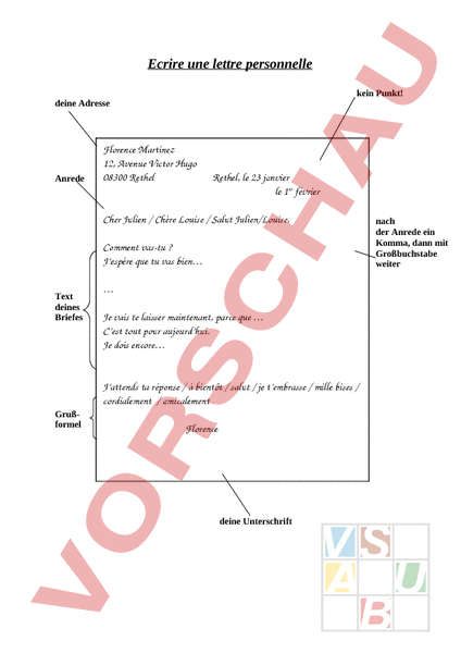 Ecrire une lettre personnelle kein Punkt! deine Adresse Anrede Florence Martinez 12, Avenue Victor Hugo 08300 Rethel Rethel, le 23 janvier le 1er février Cher Julien Chère Louise Salut Julien/Louise, Comment vastu Jespère que tu vas bien Text deines Briefes Je vais te laisser maintenant, parce que Cest tout pour aujourdhui. Je dois encore Jattends ta réponse à bientôt salut je tembrasse mille bises cordialement amicalement Grußformel Florence deine Unterschrift nach der Anrede ein Komma, dann mit Großbuchstabe weiter