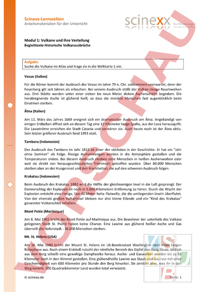 Scinexx-Lernwelten Arbeitsmaterialien für den Unterricht Modul 1: Vulkane und ihre Verteilung Begleittexte Historische Vulkanausbrüche Aufgabe: Suche die Vulkane im Atlas und trage sie in die Weltkarte 1 ein. Vesuv (Italien) Für die Römer kommt der Ausbruch des Vesuv im Jahre 79 n. Chr. vollkommen unerwartet, denn der Feuerberg gilt seit Jahren als erloschen. Bei seinem Ausbruch stößt der Vulkan riesige Rauchwolken aus. Drei Städte werden unter einer sieben bis neun Meter dicken Aschenschicht begraben. Die herabregnende Asche ist glühend heiß, so dass die meisten Menschen fast augenblicklich beim Einatmen sterben. Ätna (Italien) Am 11. März des Jahres 1669 ereignet sich ein dramatischer Ausbruch am Ätna. Angekündigt von einigen Erdbeben öffnet sich an diesem Tag eine 12 Kilometer lange Spalte, aus der Lava herausquillt. Die Lavaströme erreichen die Stadt Catania und zerstören sie. Auch heute noch ist der Ätna aktiv. Sein letzter größerer Ausbruch fand 1993 statt. Tambora (Indonesien) Der Ausbruch des Tambora im Jahr 1815 ist einer der stärksten in der Geschichte. Er hat ein Jahr ohne Sommer als Folge. Riesige Aschenmengen werden in die Atmosphäre gestoßen und die Temperaturen sinken. Bei diesem Ausbruch sterben viele Menschen in heißen Aschenwolken oder weil sie direkt von herausgeschleuderten Trümmern getroffen wurden. Über 80.000 Menschen sterben aber an der Hungersnot und den Krankheiten, die auf den schweren Ausbruch folgen. Krakatau (Indonesien) Beim Ausbruch des Krakatau 1883 wird die Hälfte der gleichnamigen Insel in die Luft gesprengt. Der Donnerschlag der Explosion ist noch in 5.000 Kilometern Entfernung zu hören. Durch die Wucht der Explosion entsteht eine riesige, fast 40 Meter hohe Flutwelle, die die umliegenden Inseln überflutet. Von der ehemals großen Vulkaninsel bleiben nur drei kleine Eilande und ein Kind des Krakatau genannter Vulkanschlot erhalten. Mont Pelée (Martinique) Am 8. Mai 1902 bricht der Mont Pelée auf Martinique aus. Die Bewohner der unterhalb des Vulkans gelegenen Stadt St. Pierre haben keine Chance. Eine Lawine aus glühend heißer Asche und Gas überrollt die Hafenstadt 36.000 Menschen sterben. Mt. St. Helens (USA) Am 18. Mai 1980 bricht der Mount St. Helens im US-Bundesstaat Washington nach einer langen Ruhephase aus. Nach einem Erdstoß rutscht der nördliche Bereich des Gipfel den Hang hinab. Seitlich aus dem Berg schießt eine gewaltige Dampfwolke heraus. Asche- und Gaswolken werden bis zu 18 Kilometer hoch in den Himmel gestoßen. Eine glühendheiße Lawine aus Staub und Gas rast mit einer Geschwindigkeit von 600 Kilometer pro Stunde den Berg hinunter. Sie zerstört alles, was ihr in den Weg kommt. 500 Quadratkilometer Land wurden total verwüstet. scinexx.de Seite: 1 Scinexx-Lernwelten Arbeitsmaterialien für den Unterricht Nevado del Ruiz (Kolumbien) 1985 bricht der über 5.000 Meter hohe und ständig von Schnee und Eis bedeckte Nevado del Ruiz aus. Obwohl die Explosion nicht besonders stark ist, geht von dem Berg eine extreme Gefahr aus. Die Schnee- und Eismassen am Gipfel beginnen zu schmelzen, vermischen sich mit Böden und Geröll und schießen die Hänge herunter. Diese Schlammströme erreichen die Stadt Armero und reißen die Menschen in den Tod. Merapi (Indonesien) Der Merapi auf der Insel Java ist ein besonders aktiver Vulkan. In regelmäßigen Abständen ungefähr alle fünf bis zehn Jahre kommt es zu mehr oder weniger starken Ausbrüchen. Bei diesen Explosionen rast dann eine gefährliche Mischung aus Gas und losem vulkanischen Material bergab. So geschah es auch 1932. Damit in Zukunft Vulkanausbrüche besser vorhergesagt werden können, untersuchen Wissenschaftler den Merapi besonders intensiv. (Bilder: USGS/NASA) scinexx.de Seite: 2
