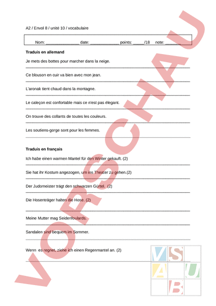 A2 Envol 8 unité 10 vocabulaire Nom: date: points:/18 note: Traduis en allemand Je mets des bottes pour marcher dans la neige. Ce blouson en cuir va bien avec mon jean. Laronak tient chaud dans la montagne. Le caleçon est confortable mais ce nest pas élegant. On trouve des collants de toutes les couleurs. Les soutiens-gorge sont pour les femmes. Traduis en français Ich habe einen warmen Mantel für den Winter gekauft. (2) Sie hat ihr Kostum angezogen, um ins Theater zu gehen.(2) Der Judomeister trägt den schwarzen Gürtel. (2) Die Hosenträger halten die Hose. (2) Meine Mutter mag Seidenfoulards. Sandalen sind bequem im Sommer. Wenn es regnet, ziehe ich einen Regenmantel an. (2)