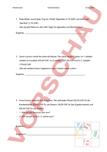 Mathematik Ventil Dietikon 12.03.2013 1. Peter Müller raucht jeden Tag ein „Päckli Zigaretten (7.70 CHF) und trinkt zwei „Red Bull (1.70 CHF). Wie viel gibt Peter pro Jahr (365 Tage) für Zigaretten und Red Bull aus? Ergebnis: 2. Goran Lanovic macht die Lehre als Maurer. Die Lehre dauert 3 Jahre. Im 1.Lehrjahr verdient er monatlich 876.00 CHF, im 2.Lehrjahr 1221.00 CHF und im 3. Lehrjahr 1778.00 CHF. Wie viel verdient Goran insgesamt in den 3 Jahren seiner Lehre? Ergebnis: 3. Anna Kromer überprüft ihre Ausgaben. Sie zahlt jeden Monat 342.00 CHF für die Krankenkasse, 800.00 CHF für die Steuern, 95.00 CHF für das Zugabonnement und 600.00 CHF für das Essen. 1. Wie viel gibt Anna pro Jahr aus? 2. Wie viel gibt Anna in 11 Jahren aus? Ergebnis 1: Ergebnis 2: Mathematik Ventil Dietikon 12.03.2013 4. Ein Plattenleger braucht 180 Minuten um eine Fläche von 65m2 mit Platten zu bestücken. Wie lange braucht der Plattenleger für eine Fläche von 114m2? Ergebnis: 5. Roger Federer hat im Jahr 2012 mit Preisgeldern und Sponsoreneinnahmen 96‘550‘000 CHF verdient. Von diesem Betrag muss Roger 14,5% Steuern bezahlen. Wie viel seines Gewinnes kann Roger Federer nach Abgabe der Steuer behalten? Ergebnis: 6. Peter Lustig verdient monatlich 4‘150 CHF. Er arbeitet täglich 8 Stunden und 20 Tage pro Monat. 1. Wie viele Monate muss Peter arbeiten, damit er 1‘000‘150 CHF verdient? 2. Wie viel verdient Peter pro Stunde? Ergebnis 1: Ergebnis 2: Mathematik Ventil Dietikon 12.03.2013 7. Peter Müller raucht jeden Tag ein „Päckli Zigaretten (7.70 CHF) und trinkt zwei „Red Bull (1.70 CHF). Wie viel gibt Peter pro Jahr (365 Tage) für Zigaretten und Red Bull aus? Ergebnis: 4051.50 CHF 8. Goran Lanovic macht die Lehre als Maurer. Die Lehre dauert 3 Jahre. Im 1.Lehrjahr verdient er monatlich 876.- CHF, im 2.Lehrjahr 1221.- CHF und im 3. Lehrjahr 1778.- CHF. Wie viel verdient Goran insgesamt in den 3 Jahren seiner Lehre? Ergebnis: 46‘500.- CHF 9. Anna Kromer überprüft ihre Ausgaben. Sie zahlt jeden Monat 342.00 CHF für die Krankenkasse, 800.00 CHF für die Steuern, 95.00 CHF für das Zugabonnement und 600.00 CHF für das Essen. 1. Wie viel gibt Anna pro Jahr aus? 2. Wie viel gibt Anna in 11 Jahren aus? Ergebnis 1: 22‘044.- CHF Ergebnis 2: 2‘424‘484.- CHF Mathematik Ventil Dietikon 12.03.2013 10. Ein Plattenleger braucht 180 Minuten um eine Fläche von 65m2 mit Platten zu bestücken. Wie lange braucht der Plattenleger für eine Fläche von 114m2? (Runde auf 1 Minute) Ergebnis: 316 Minuten 11. Roger Federer hat im Jahr 2012 mit Preisgeldern und Sponsoreneinnahmen 96‘550‘000.- CHF verdient. Von diesem Betrag muss Roger 14,5% Steuern bezahlen. Wie viel seines Gewinnes kann Roger Federer nach Abgabe der Steuer behalten? Ergebnis: 82‘550‘250.- CHF 12. Peter Lustig verdient monatlich 4‘150 CHF. Er arbeitet täglich 8 Stunden und 20 Tage pro Monat. 1. Wie viele Monate muss Peter arbeiten, damit er 1‘000‘150 CHF verdient? 2. Wie viel verdient Peter pro Stunde? (Runde auf 5 Rappen genau) Ergebnis 1: 241 Monate Ergebnis 2: 25.95 CHF