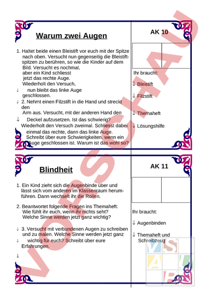 Warum zwei Augen 1. Haltet beide einen Bleistift vor euch mit der Spitze nach oben. Versucht nun gegenseitig die Bleistiftspitzen zu berühren, so wie die Kinder auf dem Bild. Versucht es nochmal, aber ein Kind schliesst jetzt das rechte Auge. Wiederholt den Versuch, nun bleibt das linke Auge geschlossen. 2. Nehmt einen Filzstift in die Hand und streckt den Arm aus. Versucht, mit der anderen Hand den Deckel aufzusetzen. Ist das schwierig? Wiederholt den Versuch zweimal. Schliesst dabei einmal das rechte, dann das linke Auge. Schreibt über eure Schwierigkeiten, wenn ein Auge geschlossen ist. Warum ist das wohl so? Blindheit AK 10 Ihr braucht: Bleistift Filzstift Themaheft Lösungshilfe AK 11 1. Ein Kind zieht sich die Augenbinde über und lässt sich vom anderen im Klassenraum herumführen. Dann wechselt ihr die Rollen. 2. Beantwortet folgende Fragen ins Themaheft: Wie fühlt ihr euch, wenn ihr nichts seht? Welche Sinne werden jetzt ganz wichtig? Ihr braucht: Augenbinden 3. Versucht mit verbundenen Augen zu schreiben und zu malen. Welche Sinne werden jetzt ganz Themaheft und wichtig für euch? Schreibt über eure Schreibzeug Erfahrungen.