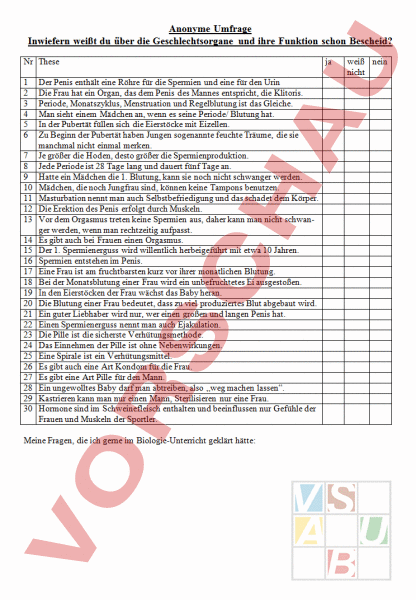 Anonyme Umfrage Inwiefern weißt du über die Geschlechtsorgane und ihre Funktion schon Bescheid? Nr These 1 2 3 4 5 6 7 8 9 10 11 12 13 14 15 16 17 18 19 20 21 22 23 24 25 26 27 28 29 30 Der Penis enthält eine Röhre für die Spermien und eine für den Urin Die Frau hat ein Organ, das dem Penis des Mannes entspricht, die Klitoris. Periode, Monatszyklus, Menstruation und Regelblutung ist das Gleiche. Man sieht einem Mädchen an, wenn es seine Periode/ Blutung hat. In der Pubertät füllen sich die Eierstöcke mit Eizellen. Zu Beginn der Pubertät haben Jungen sogenannte feuchte Träume, die sie manchmal nicht einmal merken. Je größer die Hoden, desto größer die Spermienproduktion. Jede Periode ist 28 Tage lang und dauert fünf Tage an. Hatte ein Mädchen die 1. Blutung, kann sie noch nicht schwanger werden. Mädchen, die noch Jungfrau sind, können keine Tampons benutzen. Masturbation nennt man auch Selbstbefriedigung und das schadet dem Körper. Die Erektion des Penis erfolgt durch Muskeln. Vor dem Orgasmus treten keine Spermien aus, daher kann man nicht schwanger werden, wenn man rechtzeitig aufpasst. Es gibt auch bei Frauen einen Orgasmus. Der 1. Spermienerguss wird willentlich herbeigeführt mit etwa 10 Jahren. Spermien entstehen im Penis. Eine Frau ist am fruchtbarsten kurz vor ihrer monatlichen Blutung. Bei der Monatsblutung einer Frau wird ein unbefruchtetes Ei ausgestoßen. In den Eierstöcken der Frau wächst das Baby heran. Die Blutung einer Frau bedeutet, dass zu viel produziertes Blut abgebaut wird. Ein guter Liebhaber wird nur, wer einen großen und langen Penis hat. Einen Spermienerguss nennt man auch Ejakulation. Die Pille ist die sicherste Verhütungsmethode. Das Einnehmen der Pille ist ohne Nebenwirkungen. Eine Spirale ist ein Verhütungsmittel. Es gibt auch eine Art Kondom für die Frau. Es gibt eine Art Pille für den Mann. Ein ungewolltes Baby darf man abtreiben, also „weg machen lassen. Kastrieren kann man nur einen Mann, Sterilisieren nur eine Frau. Hormone sind im Schweinefleisch enthalten und beeinflussen nur Gefühle der Frauen und Muskeln der Sportler. Meine Fragen, die ich gerne im Biologie-Unterricht geklärt hätte: ja weiß nein nicht