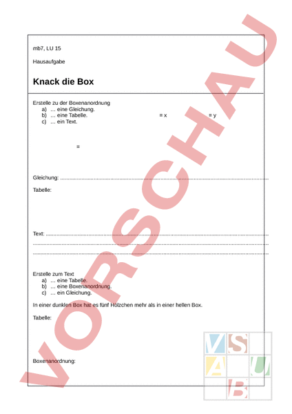 mb7, LU 15 Hausaufgabe Knack die Box Erstelle zu der Boxenanordnung a) eine Gleichung. b) eine Tabelle. c) ein Text. x y Gleichung: . Tabelle: Text: . . Erstelle zum Text a) eine Tabelle. b) eine Boxenanordnung. c) ein Gleichung. In einer dunklen Box hat es fünf Hölzchen mehr als in einer hellen Box. Tabelle: Boxenanordnung: Gleichung: .