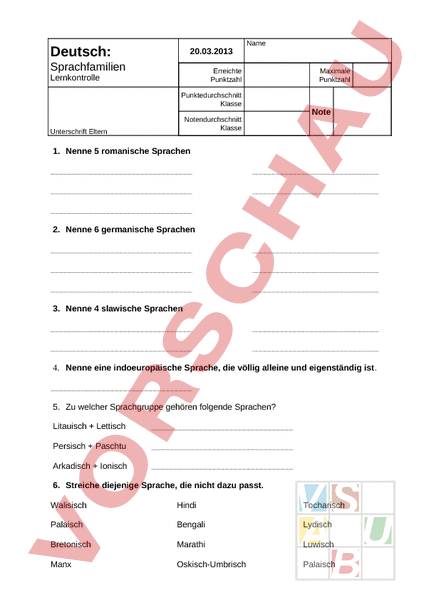 Deutsch: 20.03.2013 Sprachfamilien Name Erreichte Punktzahl Lernkontrolle Punktedurchschnitt Klasse Notendurchschnitt Klasse Unterschrift Eltern Maximale Punktzahl Note 1. Nenne 5 romanische Sprachen 2. Nenne 6 germanische Sprachen 3. Nenne 4 slawische Sprachen 4. Nenne eine indoeuropäische Sprache, die völlig alleine und eigenständig ist. 5. Zu welcher Sprachgruppe gehören folgende Sprachen? Litauisch Lettisch Persisch Paschtu Arkadisch Ionisch 6. Streiche diejenige Sprache, die nicht dazu passt. Walisisch Hindi Tocharisch Palaisch Bengali Lydisch Bretonisch Marathi Luwisch Manx Oskisch-Umbrisch Palaisch