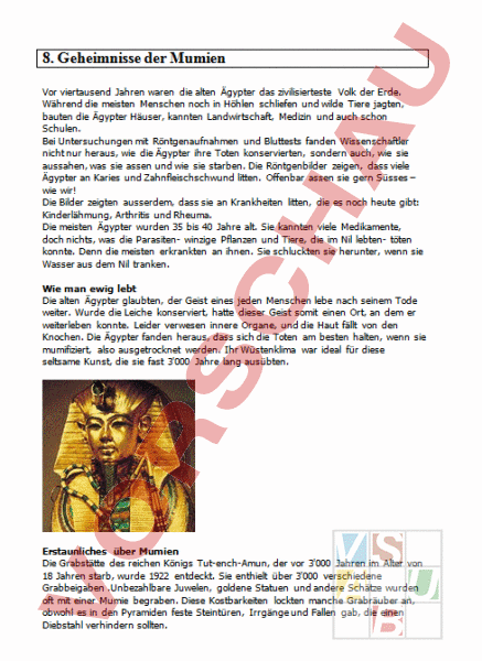 8. Geheimnisse der Mumien Vor viertausend Jahren waren die alten Ägypter das zivilisierteste Volk der Erde. Während die meisten Menschen noch in Höhlen schliefen und wilde Tiere jagten, bauten die Ägypter Häuser, kannten Landwirtschaft, Medizin und auch schon Schulen. Bei Untersuchungen mit Röntgenaufnahmen und Bluttests fanden Wissenschaftler nicht nur heraus, wie die Ägypter ihre Toten konservierten, sondern auch, wie sie aussahen, was sie assen und wie sie starben. Die Röntgenbilder zeigen, dass viele Ägypter an Karies und Zahnfleischschwund litten. Offenbar assen sie gern Süsses – wie wir! Die Bilder zeigten ausserdem, dass sie an Krankheiten litten, die es noch heute gibt: Kinderlähmung, Arthritis und Rheuma. Die meisten Ägypter wurden 35 bis 40 Jahre alt. Sie kannten viele Medikamente, doch nichts, was die Parasiten- winzige Pflanzen und Tiere, die im Nil lebten- töten konnte. Denn die meisten erkrankten an ihnen. Sie schluckten sie herunter, wenn sie Wasser aus dem Nil tranken. Wie man ewig lebt Die alten Ägypter glaubten, der Geist eines jeden Menschen lebe nach seinem Tode weiter. Wurde die Leiche konserviert, hatte dieser Geist somit einen Ort, an dem er weiterleben konnte. Leider verwesen innere Organe, und die Haut fällt von den Knochen. Die Ägypter fanden heraus, dass sich die Toten am besten halten, wenn sie mumifiziert, also ausgetrocknet werden. Ihr Wüstenklima war ideal für diese seltsame Kunst, die sie fast 3 00 Jahre lang ausübten. Erstaunliches über Mumien Die Grabstätte des reichen Königs Tut-ench-Amun, der vor 3 00 Jahren im Alter von 18 Jahren starb, wurde 1922 entdeckt. Sie enthielt über 3 00 verschiedene Grabbeigaben .Unbezahlbare Juwelen, goldene Statuen und andere Schätze wurden oft mit einer Mumie begraben. Diese Kostbarkeiten lockten manche Grabräuber an, obwohl es in den Pyramiden feste Steintüren, Irrgänge und Fallen gab, die einen Diebstahl verhindern sollten. Wie man mumifizierte Zuerst musste man der Leiche das Hirn mit einem Haken durch die Nase ziehen. Dann wurden die inneren Organe durch einen seitlichen Schnitt am Körper entfernt. Die Leiche wurde in Natron, einer salzhaltigen Substanz, eingelegt und zum Trocknen vierzig Tage liegengelassen. War die Leiche einbalsamiert und trocken, wirkte sie schlaff und leblos. Daher füllte man Sägespäne in sie, damit sie lebendiger wirkte. Dann wusch man den Toten mit Wein und Gewürzen, bestrich ihn mit Harz, damit die Haut weich blieb, wickelte ihn in Bandagen und liess ihn 30 Tage liegen. Für die Bandagen wurden mehrere hundert Meter Leinen gewickelt. Eine lebensechte Maske wurde der Mumie aufs Gesicht gelegt. Schliesslich brachte man die Mumie der Familie zur Bestattung zurück. Manche Mumien haben heute noch ihr Haar, Finger- und Zehennägel und sogar ihre Augenlider. Grabbeilagen Die einbalsamierte Mumie legte man in einen Sarg. Oft malte man das Auge des Horus aussen auf die Seite des Sargs, damit die Mumie nach draussen sehen konnte Dieser Sarg wiederum kam in einen mächtigen Steinbehälter, den so genannten Sarkophag. Die inneren Organe wurden getrocknet, in Leinen gewickelt und zur Beisetzung neben der Mumie in Urnen gelegt, die man Kanopen nennt Die Ägypter glaubten, sie könnten auch nach dem Tod noch essen und trinken, lesen und herumlaufen. Die kleinen Holzfiguren, die man mit den Mumien bestattete, sollten dem Toten später als Sklaven dienen. Das ägyptische Totenbuch war eine Sammlung von Zaubersprüchen, die auf Papyrus geschrieben waren. Man legte es mit ins Grab, damit es der Mumie auf ihrer Reise half.