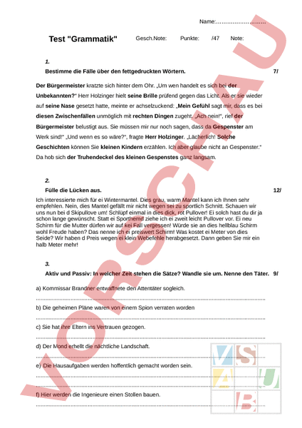 Name: Test Grammatik Gesch.Note: Punkte: /47 Note: 1. Bestimme die Fälle über den fettgedruckten Wörtern. 7/ Der Bürgermeister kratzte sich hinter dem Ohr. „Um wen handelt es sich bei der Unbekannten? Herr Holzinger hielt seine Brille prüfend gegen das Licht. Als er sie wieder auf seine Nase gesetzt hatte, meinte er achselzuckend: „Mein Gefühl sagt mir, dass es bei diesen Zwischenfällen unmöglich mit rechten Dingen zugeht. „Ach nein!, rief der Bürgermeister belustigt aus. Sie müssen mir nur noch sagen, dass da Gespenster am Werk sind! „Und wenn es so wäre?, fragte Herr Holzinger. „Lächerlich! Solche Geschichten können Sie kleinen Kindern erzählen. Ich aber glaube nicht an Gespenster. Da hob sich der Truhendeckel des kleinen Gespenstes ganz langsam. 2. Fülle die Lücken aus. 12/ Ich interessierte mich für ei Wintermantel. Dies grau, warm Mantel kann ich Ihnen sehr empfehlen. Nein, dies Mantel gefällt mir nicht wegen sei zu sportlich Schnitt. Schauen wir uns nun bei Skipullove um! Schlüpf einmal in dies dick, rot Pullover! Ei solch hast du dir ja schon lange gewünscht. Statt ei Sporthemd ziehe ich ei zweit leicht Pullover vor. Ei neu Schirm für die Mutter dürfen wir auf kei Fall vergessen! Würde sie an dies hellblau Schirm wohl Freude haben? Das nenne ich ei preiswert Schirm! Was kostet ei Meter von dies Seide? Wir haben Preis wegen ei klein Webefehle herabgesetzt. Dann geben Sie mir ein halb Meter mehr! 3. Aktiv und Passiv: In welcher Zeit stehen die Sätze? Wandle sie um. Nenne den Täter. 9/ a) Kommissar Brandner entwaffnete den Attentäter sogleich. b) Die geheimen Pläne waren von einem Spion verraten worden c) Sie hat ihre Eltern ins Vertrauen gezogen. d) Der Mond erhellt die nächtliche Landschaft. e) Die Hausaufgaben werden hoffentlich gemacht worden sein. f) Hier werden die Ingenieure einen Stollen bauen. 4. Streiche die Verben an und markiere in der Tabelle die zutreffenden Felder. 7/ a) Ein Mann mit Schlapphut hatte die mysteriöse Botschaft im hohlen Baum am Eingangstor deponiert. b) Das Tor wird geöffnet. c) Der erste Motorflug wurde von den Brüdern Wright unternommen. d) Die Hausaufgabe wird bis morgen gemacht sein. e) Wir sind gestern im Kino gewesen. f) Das Gebäude wird vom Securitas bewacht worden sein. g) Unsere Freundschaft wird durch kleine Geschenke erhalten. h) Wir werden diesen Sommer in den Norden reisen. i) Der Garten ist schön gemacht worden. 5. Fülle den Lückentext in der Er-Form aus. (KII-Form NICHT in der würde-Form) Infinitiv Konjunktiv 6/ Konjunktiv II gehen kommen haben fahren fliessen trinken 6. Setze in die indirekte Rede ohne die Verwendung von dass. a) Er fragte seine Freunde: Wer kommt mit? KI b) Tina verkündet: Wir werden im Oktober Zwillinge bekommen. KII c) Tim meint: Wenn ich mehr Zeit habe, werde ich wieder Gitarre spielen. KII d) Er scherzt: Wenn ich mehr Lohn erhalte, gehe ich wieder wöchentlich in die Kirche. KII e) Sie fragt ihn: Willst du mich heiraten? KI f) Der Lehrer spricht: *Wenn ihr Hilfe braucht, dann ruft mich. KII 6/