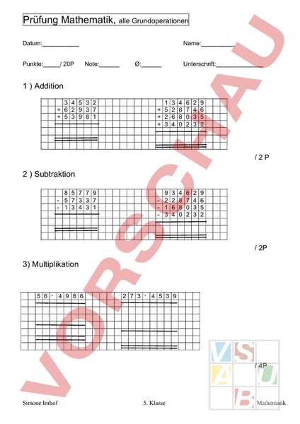 Prüfung Mathematik, alle Grundoperationen Datum:_ Punkte:_/ 20P Name: Note: Ø: Unterschrift: 1 Addition 3 4 5 3 2 6 2 9 3 7 5 3 9 8 1 1 5 2 3 3 2 6 4 4 8 8 0 6 7 0 2 2 4 3 3 9 6 5 2 /2P 2 Subtraktion 8 5 7 7 9 5 7 3 3 7 1 3 4 3 1 9 2 1 3 3 2 6 4 4 8 8 0 6 7 0 2 2 4 3 3 9 6 5 2 2P 3) Multiplikation 5 6 4 9 8 6 2 7 3 4 5 3 9 4P Simone Imhof 5. Klasse Mathematik 3 Division 3 2 1 7 2 4 2 2 8 7 8 4 1 1 2 4P 4) Finde die fehlenden Ziffern (Addition) 7 3 9 3 8 7 9 5 4 7 6 7 2 5 4 0 2 1 5 6 8 8 4 7 9 5 6 5 7 8 4 6 9 2 3 8 5 2 8 1 1 5 8 6 4 9 8 9 0 6 7 3 4 7 5 7 7 9 8 6 7 5 2 7 7 2 9 7 9 4 0 4 8 6 4 5 9 6 4 4 6 7 5 4P 5) Finde die fehlenden Ziffern (Subtraktion) 9 3 0 7 . 8 8 . 3 0 7 9 5 6 8 9 9 3 4 2 7 6 6 3 9 7 0 3 1 6 2 2 8 7 3P 6) Rechne im Kopf! 290 210 – 320 35 235 – 410 550 Simone Imhof 5. Klasse 1P Mathematik